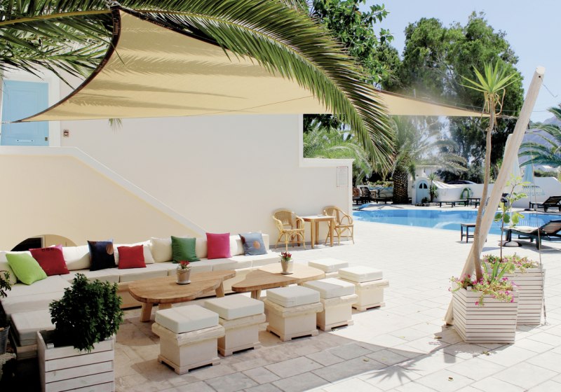 Die Anlage wirkt kompakt, gut organisiert und bequem erschlossen. Auf der Sonnenterrasse wartet Ihr mit Liegen, Sonnenschirmen und Badetüchern am Pool auf den passenden Moment zwischen Lesen und Abkühlen. Dank Adults Only ab 18 Jahren bleibt der Rahmen konsequent ruhig. Abends nehmt Ihr an der Bar einen Drink oder spaziert in wenigen Schritten in Kamaris Mitte. Für aktive Einheiten steht ein Fitnessraum bereit; wer weiterziehen will, nutzt Mietwagen- oder Fahrradverleih.