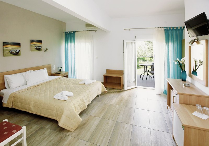 Ihr wohnt im Hauptgebäude, verteilt auf zwei Etagen. Die Zimmer bieten 21–25 Quadratmeter, einen möblierten Balkon, Dusche und WC. TV und Kühlschrank sind ebenso an Bord. Die Klimaanlage steht gegen Gebühr zur Verfügung. Euer Blick richtet sich je nach Lage auf Garten oder Land, was die ruhige Ausrichtung unterstreicht.