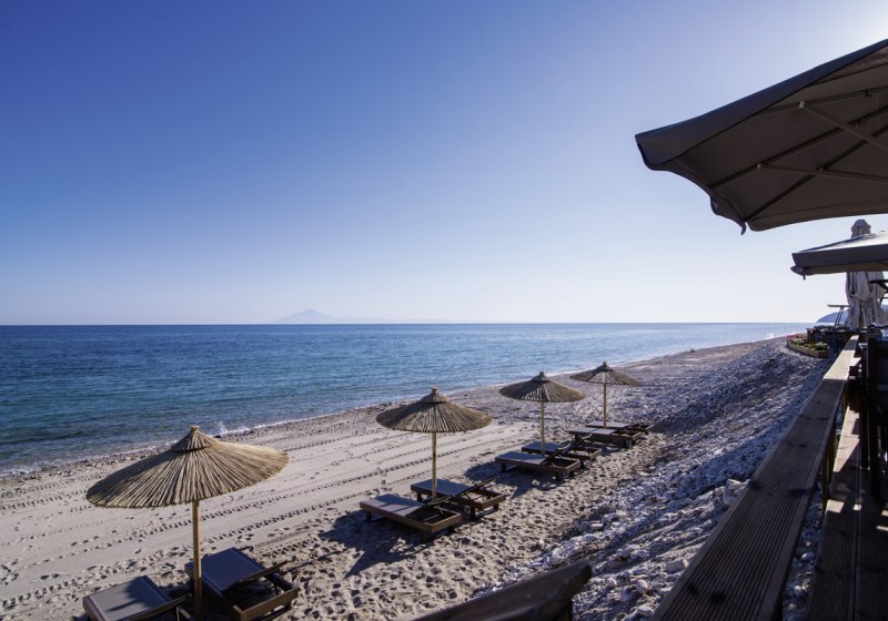 - Strandkomfort: Liegen und Schirme auch direkt am Kiesstrand.