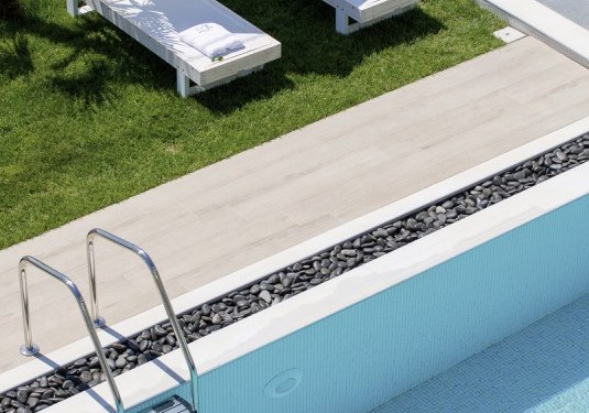 - Außenpool: Sonnenterrasse mit Liegen und Schirmen am Pool.