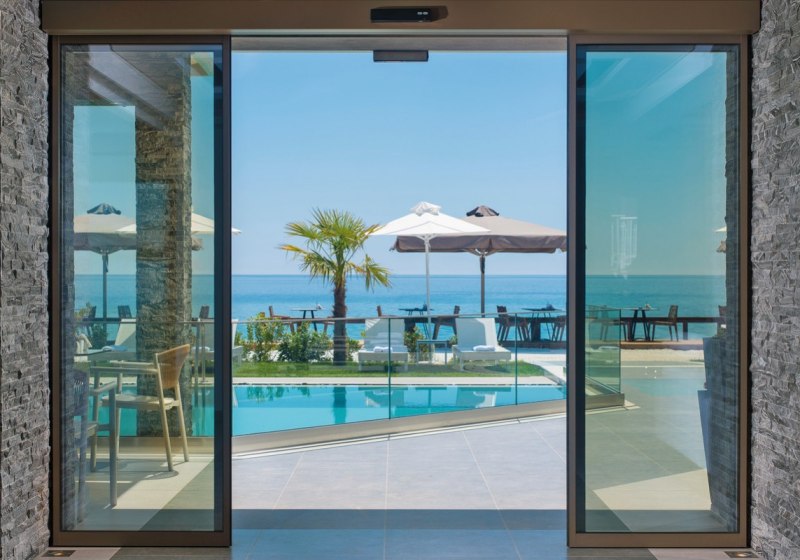 Hotel Aegean Infinity Deluxe - Limenaria empfängt Euch direkt am Strand von Limenaria mit einer kompakten, aufgeräumten Anlage und nur 24 Wohneinheiten. Das Haus wurde 2017 errichtet und wirkt entsprechend frisch und klar strukturiert. Ihr wohnt nah am Wasser, bewegt Euch zwischen Pool, Sonnenterrasse und Lobby auf kurzen Wegen und habt dabei WLAN in der gesamten Anlage. Die Atmosphäre bleibt entspannt und fokussiert auf ruhige Strandtage ohne inszeniertes Rahmenprogramm.