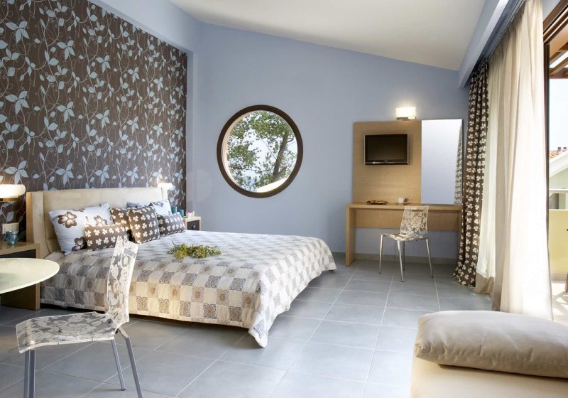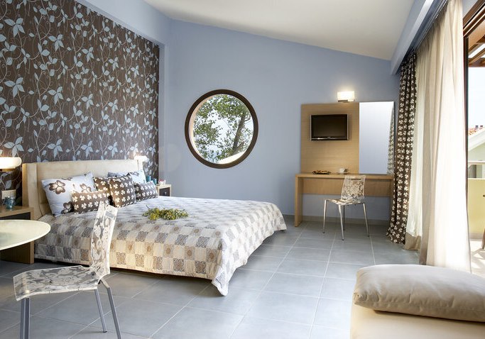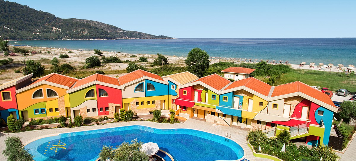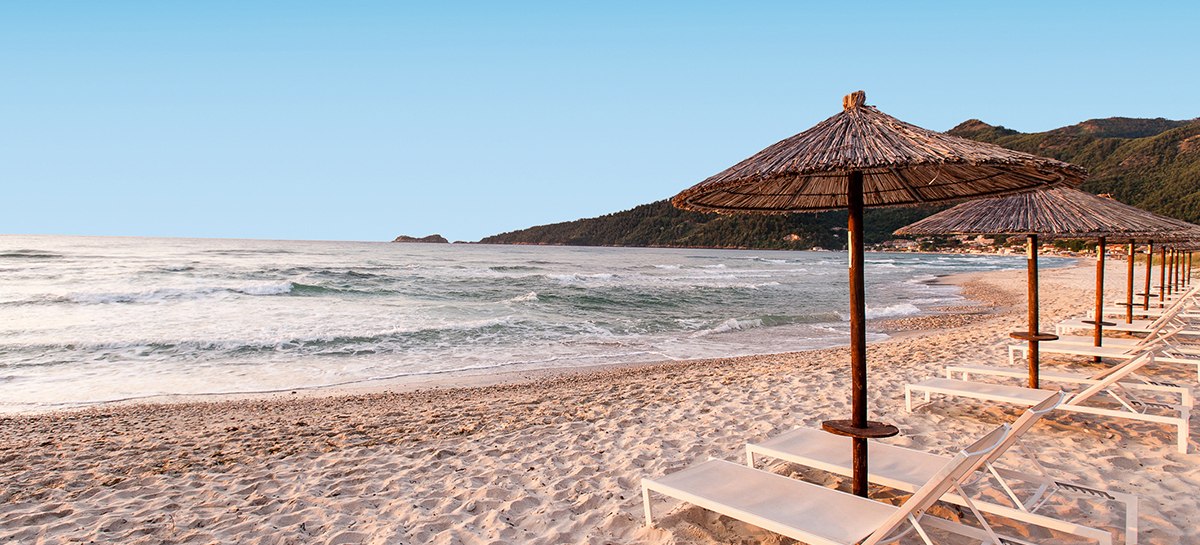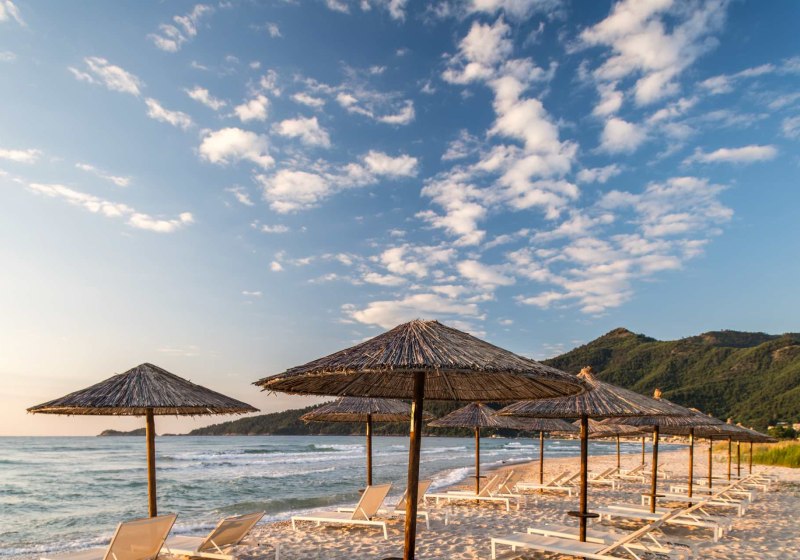 Die Lage ist der stärkste Anker: Direkt am Golden Beach wohnt Ihr mit kurzer Distanz zwischen Zimmer, Pool und Meer. Das Hotel liegt am Ortsrand von Chrissi Amoudia auf Thasos; zum Zentrum von Skala Potamia sind es etwa 2,5 Kilometer. Damit bleibt Ihr nah genug für kleine Ausflüge, aber weit genug für entspannte Tage ohne Durchgangstrubel. Das traditionsreiche Dorf Panagia erreicht Ihr nach rund 4,5 Kilometern. Für An- und Abreise oder Abstecher nach Thassos-Stadt hilft die Orientierung am Fährhafen, der rund 14 Kilometer entfernt liegt. So entsteht eine Lage, die Strandnähe, Ruhe und gute Erreichbarkeit verbindet. Der Blick richtet sich tagsüber auf das leuchtende Band des Golden Beach und abends auf sanfte Küstenstimmung – ein Rahmen, der Euren Rhythmus bestimmt.