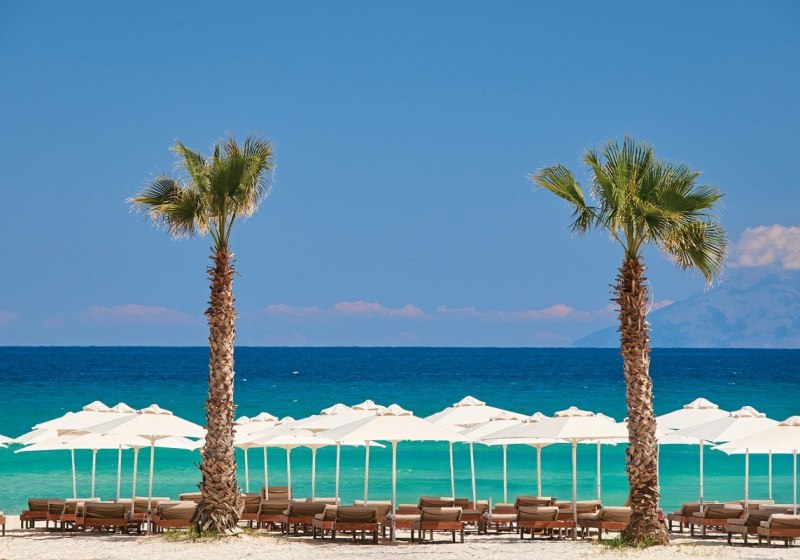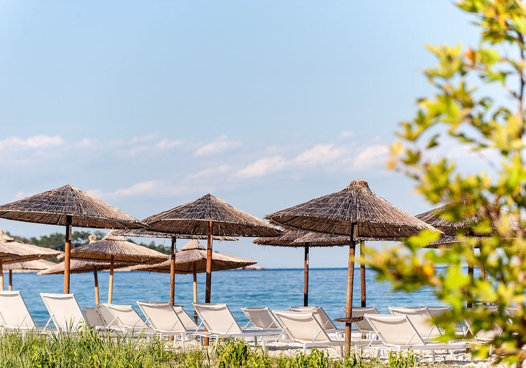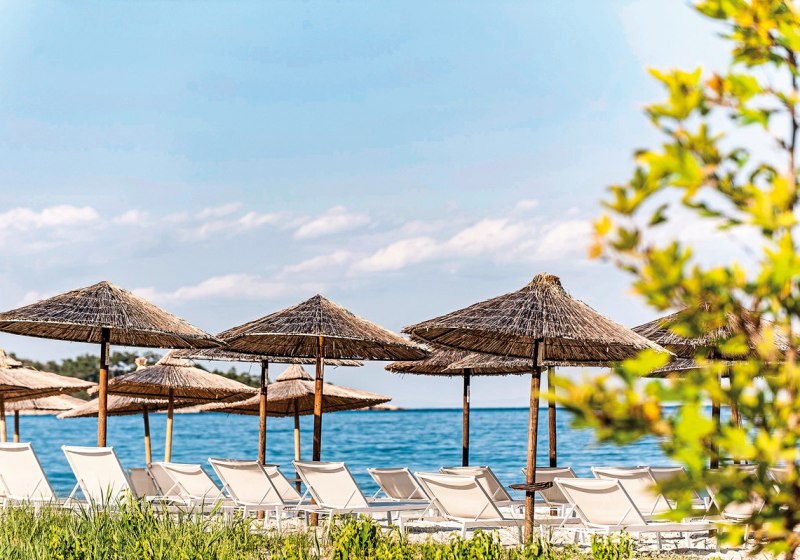 - Strandsetup: Liegen, Schirme und Tücher am Pool und am Strand.