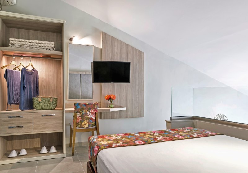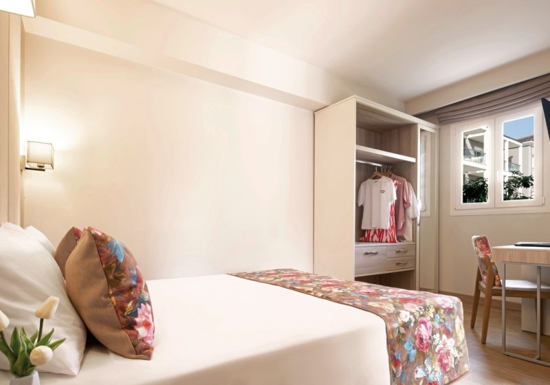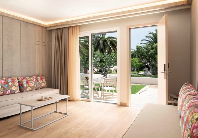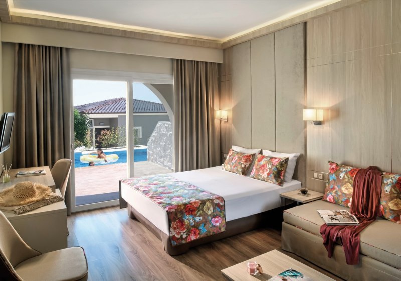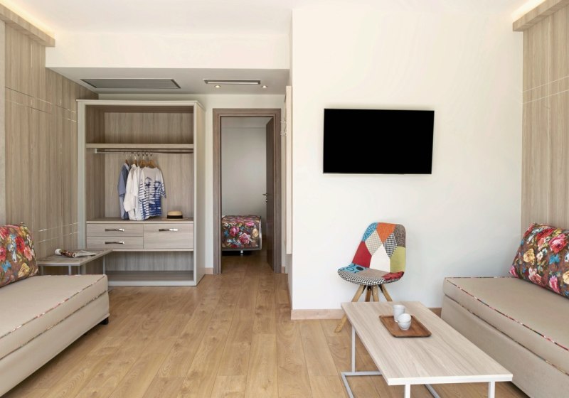 Optionen für das gewisse Extra: Zimmer mit Meerblick, mit Sharing‑Pool oder Suiten mit privatem Pool. In den Suiten liegen Bademäntel und Slipper bereit – kleine Details für fokussierten Komfort. So wählt Ihr zwischen praktischer Basis und aufgewertetem Rückzugsort, passend zu Eurer Planung der nächsten Ferien.