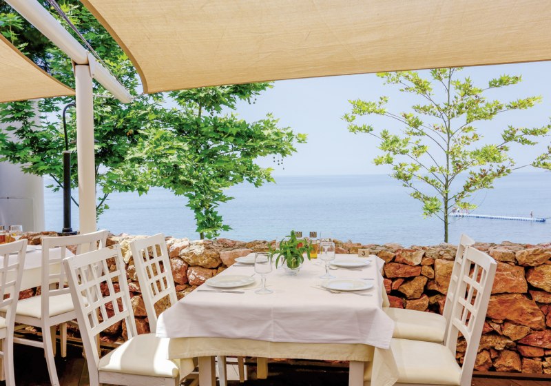 Ihr wählt zwischen Buffetrestaurant und A‑la‑carte‑Taverne – zwei Formate, die den Tag rhythmisch strukturieren: unkompliziert am Buffet, fokussierter à la carte. Drei Bars – Dachterrasse, Pool, Strand – halten Euch flexibel, ob für den Espresso zwischendurch, Sundowner oder Erfrischung nah am Wasser. Ein Minimarkt ergänzt das Angebot praktisch.