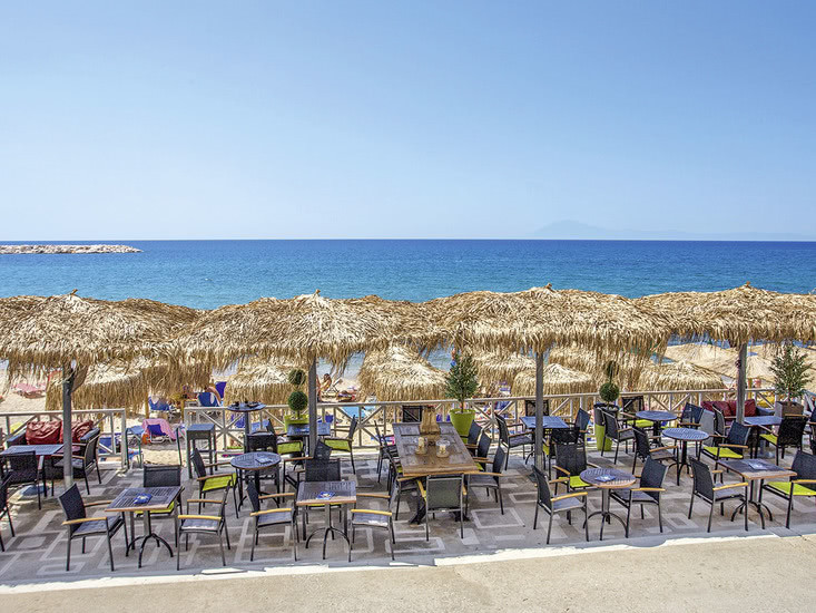 Thalassies Nouveau steht für Strandnähe, kompakte Wege und eine klare, alltagstaugliche Ausstattung. Pool mit Kinderbecken, Liegen und Sonnenschirme am Wasser, dazu flexible Gastronomie von Frühstück bis Halbpension. Bewertungen bescheinigen Lage, Zimmer, Service und Küche ein sehr hohes Niveau.