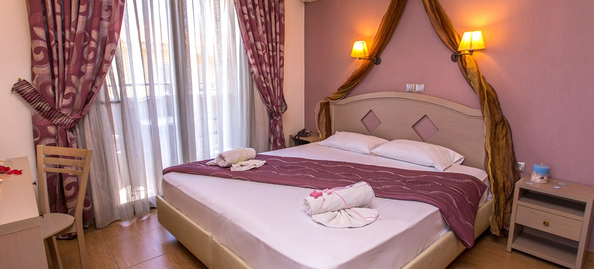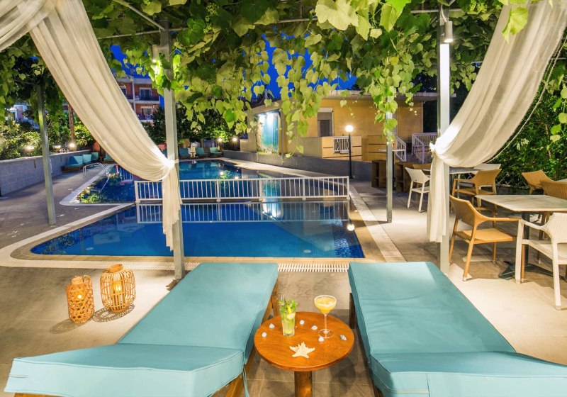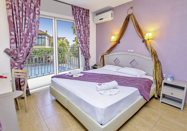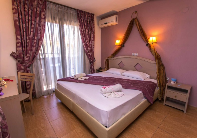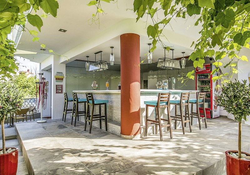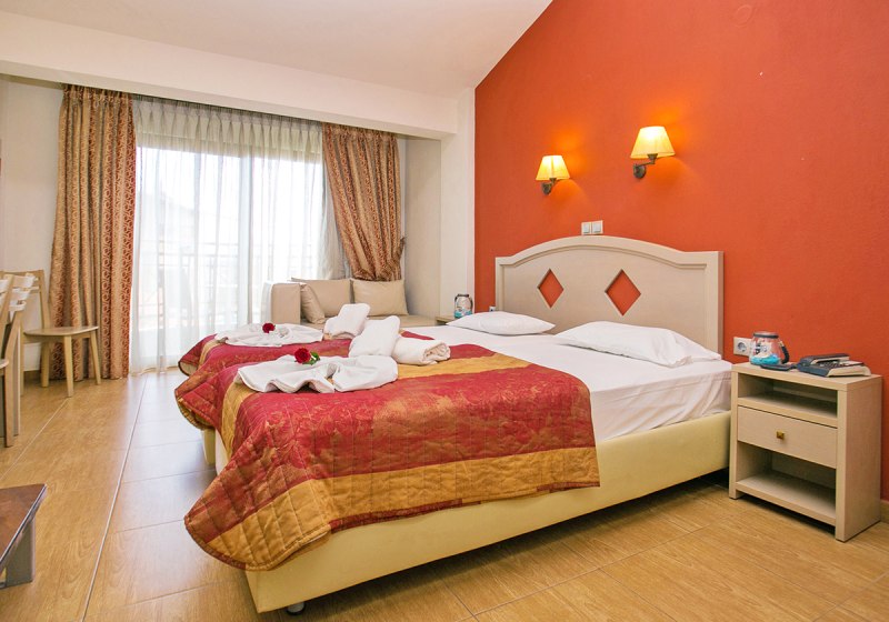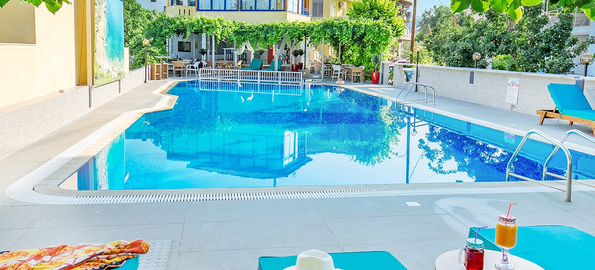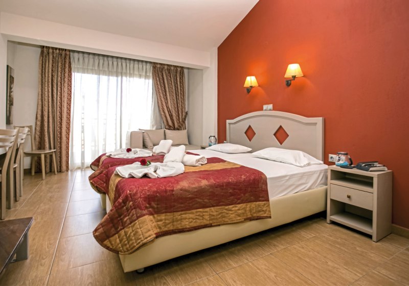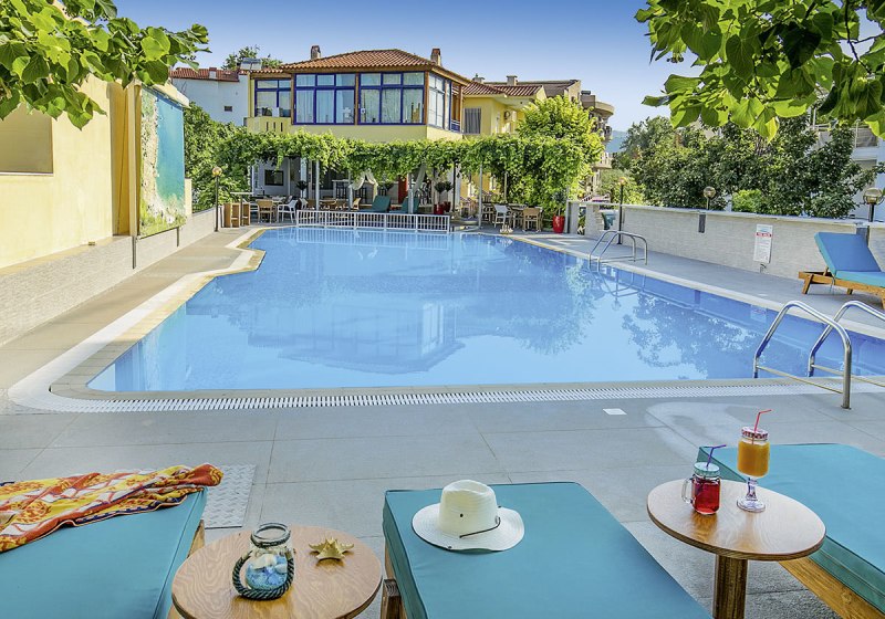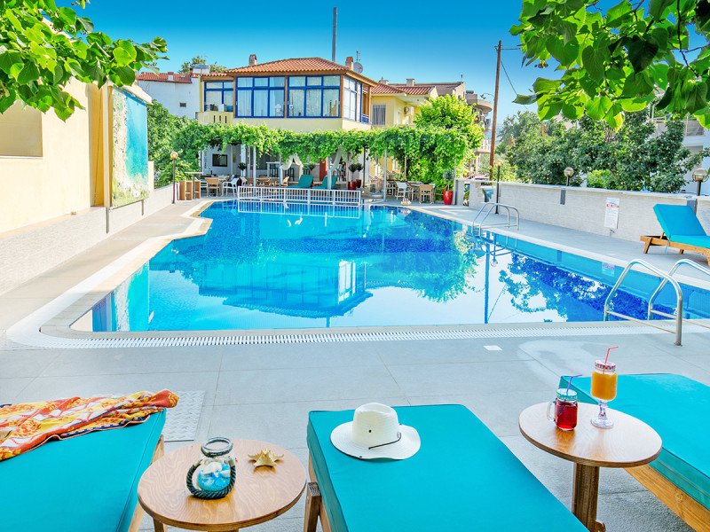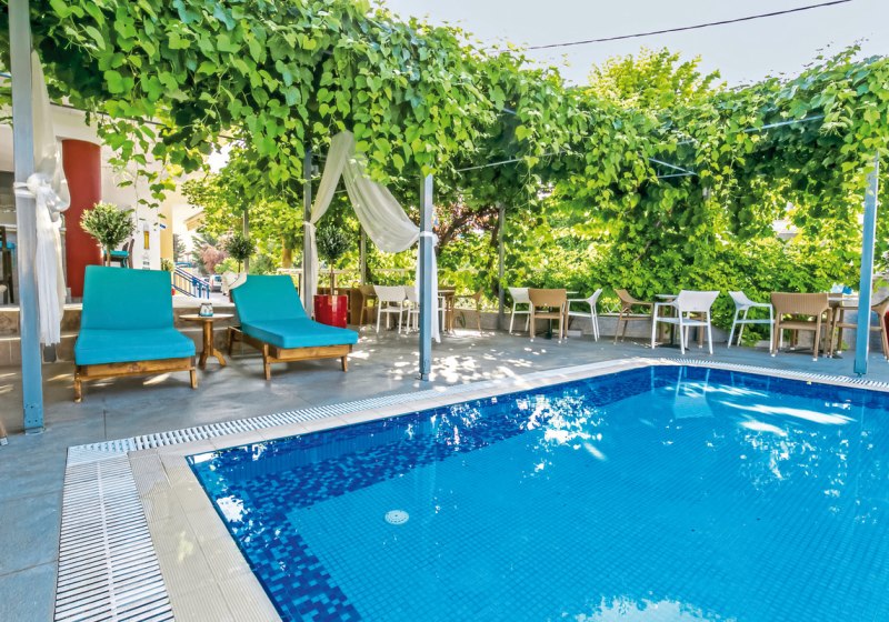 Das Ambiente wirkt unprätentiös und gepflegt: Rezeption, Aufenthaltsräume mit Sat-TV-Ecke und Internetecke, dazu Liegen und Sonnenschirme am Pool und am nahegelegenen Strand. In Eurem Tagesrhythmus bleibt Ihr flexibel: Frühstück bis Halbpension, Snacks zwischendurch, kurze Wege zum Supermarkt in 50 Metern und zur Linienbushaltestelle in circa 200 Metern. Baujahr 2008, Maisonette-Zimmer mit offener Galerie als markante Variante – alles ausgerichtet auf entspannte Tage zwischen Strandmomenten, Poolpausen und unkomplizierter Gastronomie.