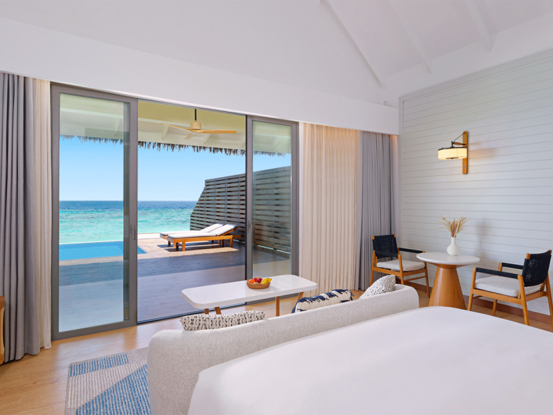 Zur Ausstattung zählen LED‑TV, Safe, Tee‑ und Kaffeezubereiter sowie Minibar. Bademantel, Hausschuhe und Föhn liegen bereit, Bügeleisen und ‑brett unterstützen längere Aufenthalte. Das halboffene Badezimmer bietet Dusche und Badewanne; in den Overwater Pool Villen wartet zusätzlich eine Hängematte über dem Wasser.