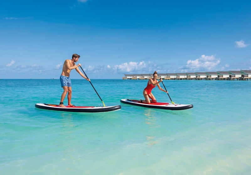 Aktiv beginnt am Strand und setzt sich über die Insel fort: Fitnesscenter, Beachvolleyball, Badminton, Paddle-Tennis, Fußballplatz und Minigolf bilden ein kompaktes Netzwerk. Im Wasser warten Schnorcheln und Tauchen, dazu Kajak, Kanu, Segeln, Windsurfen, Wasserski und weitere Optionen. Highlight: Hausriff in Schwimmnähe – kurze Wege zu farbigem Leben.