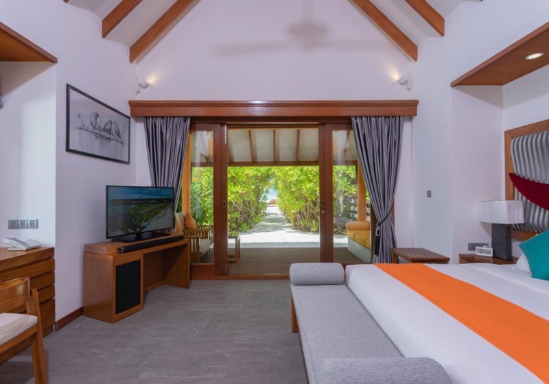 Die Sunrise Beach Villa (ca. 49 m²) öffnet sich über eine Veranda mit Sitzgelegenheiten direkt zum Strand. Badewanne, Dusche/WC, Föhn, Bademantel, Klimaanlage, Safe, Minibar (gegen Gebühr), Telefon, LED-TV sowie Kaffee- und Teezubereiter strukturieren den Komfort; der Blick führt unmittelbar in Richtung Wasserlinie.