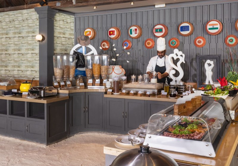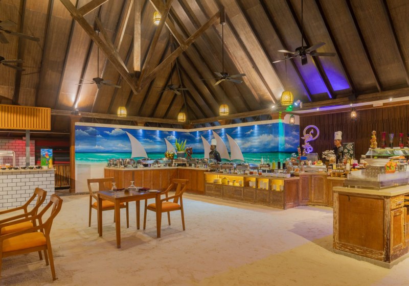 - Drei Restaurants: Buffet, Fine Dining über Wasser und Strandgrill bieten Auswahl.