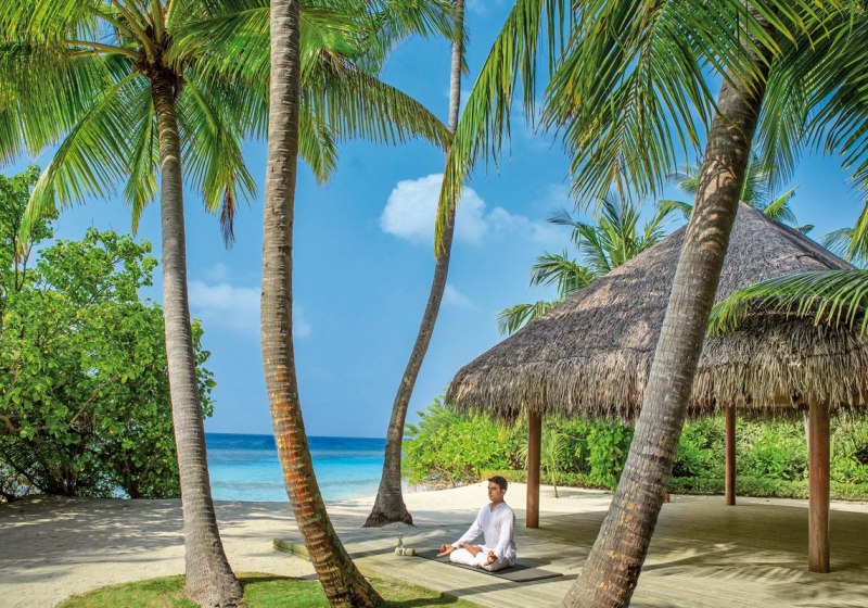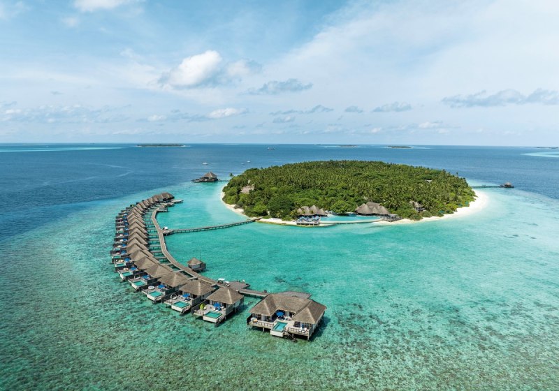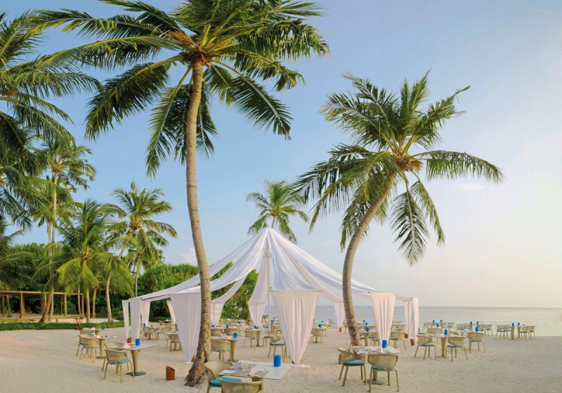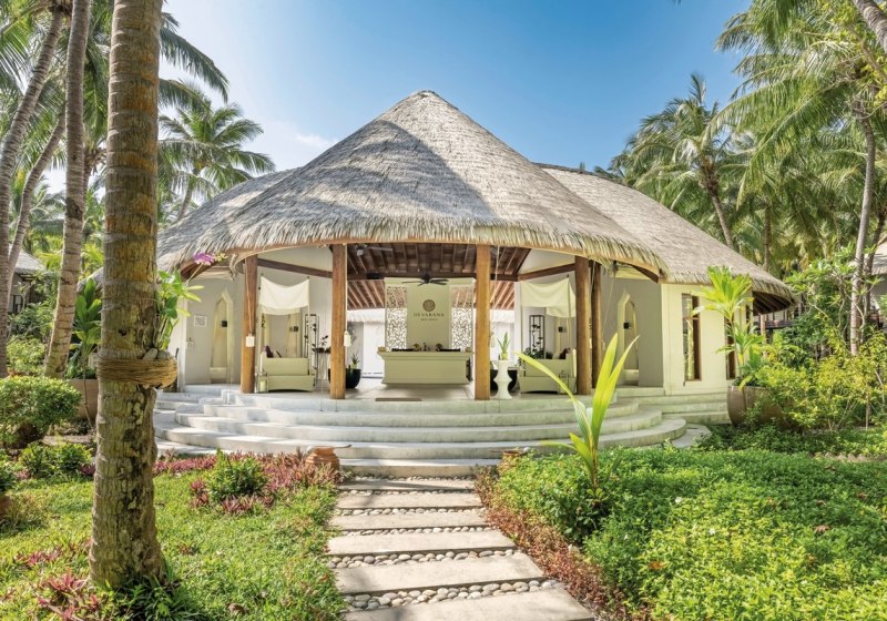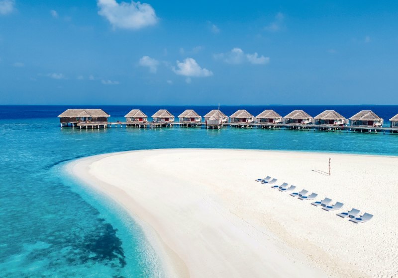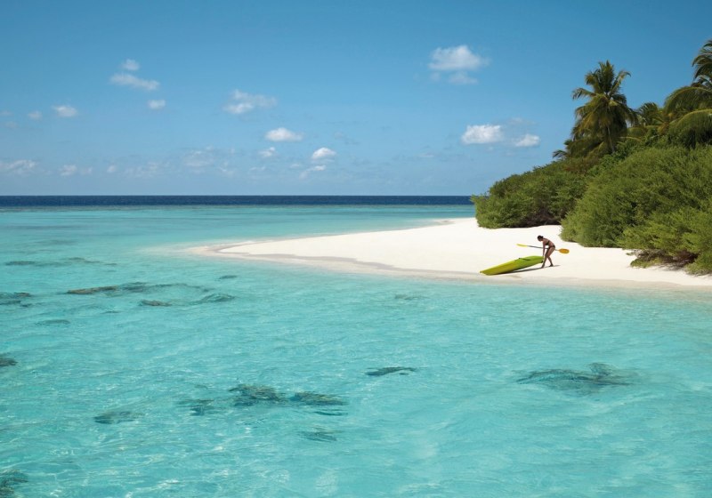 Ihr reist per Wasserflugzeug in etwa 35 Minuten an oder kombiniert Inlandsflug und Speedboot in rund 30 Minuten. Das Resort liegt auf Mudhdhoo im UNESCO-Biosphärenreservat Baa-Atoll. Der Strand ist mit Liegen und Sonnenschirmen ausgestattet, eine Beachbar serviert Erfrischungen. Die Szenerie: helle Sandbänke, klare Lagune, dichter Bewuchs.