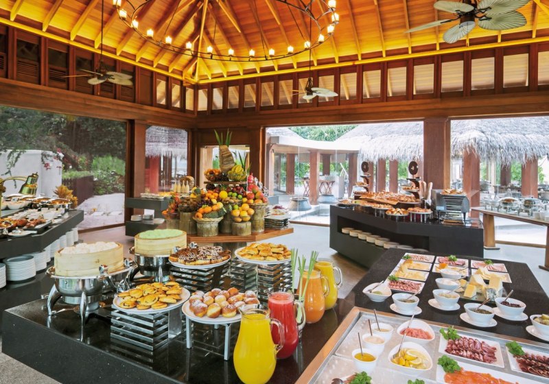 Minibar, Weinkühlschrank, Nespresso-Maschine und Wasserkocher unterstützen kleine Genussmomente. Waterfront- und Overwater-Pool-Villen liegen über der Lagune, erreichbar über Stege, mit privatem Pool und direktem Meerzugang. Bademäntel, Slipper und Föhn runden den Komfort ab – ideal für Paare, Freunde und Familien.