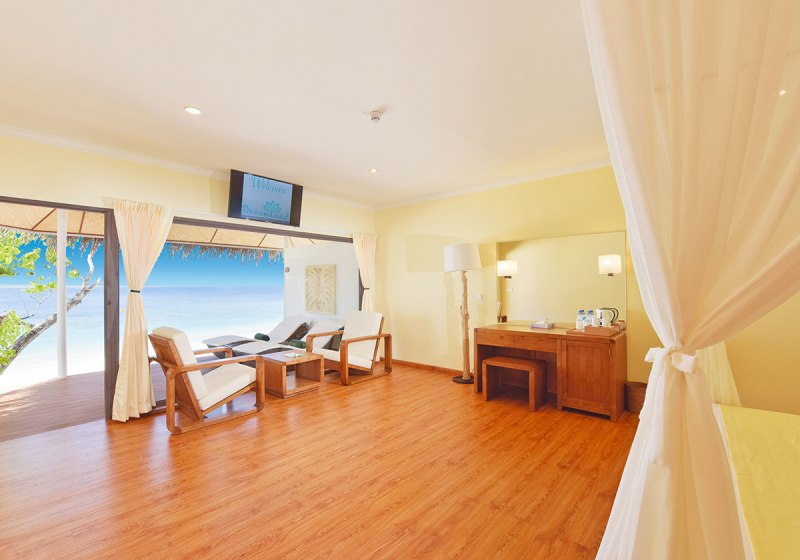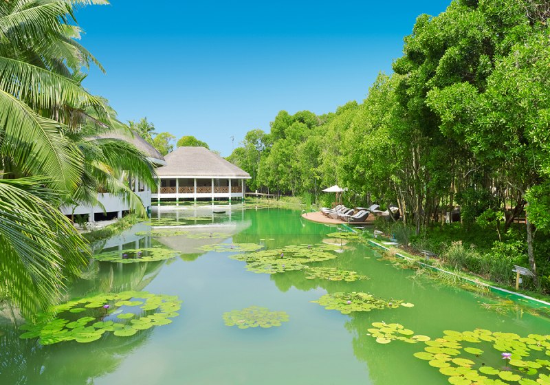 In Dreamland The Unique Sea & Lake Resort / Spa erlebt Ihr ein Resort, das Meer und Süßwasser in einer eindrücklichen Kulisse vereint. Die Insel im Baa-Atoll trägt einen 1.600-Quadratmeter-See mit Seerosen im Herzen und rahmt ihn mit hellem Sandstrand und dem Indischen Ozean. Die Atmosphäre wirkt authentisch tropisch: luftige Wege, viel Grün und durchdachte Rückzugsorte.