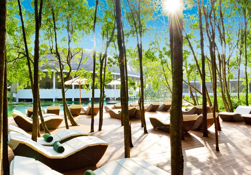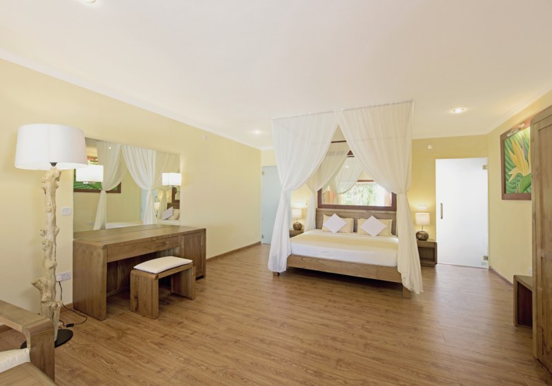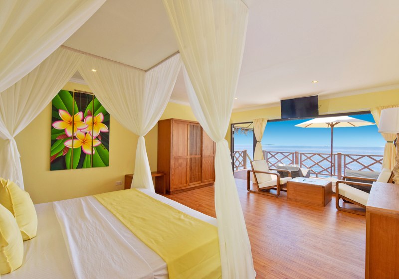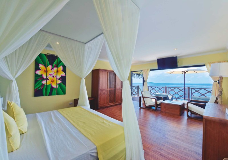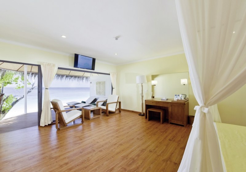 Ihr wohnt in 90 Einheiten an Land oder über der Lagune. Strand- und Wasser-Bungalows bieten jeweils etwa 78 Quadratmeter Fläche. In den Strand-Bungalows blickt Ihr aufs Meer; die Wasser-Bungalows stehen auf Stelzen und führen Euch über private Stufen direkt ins Blau.