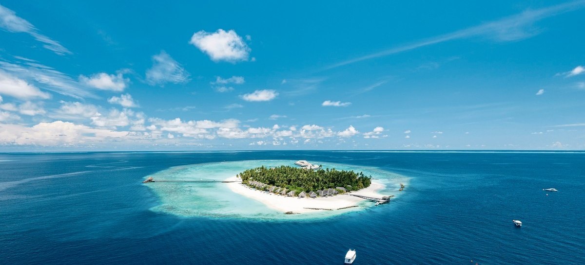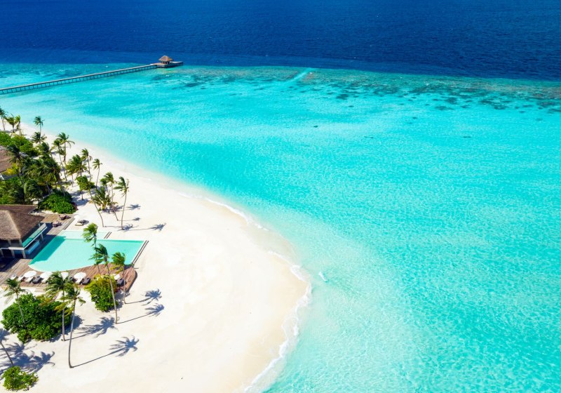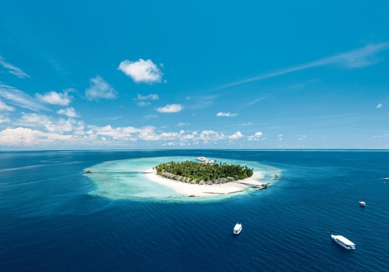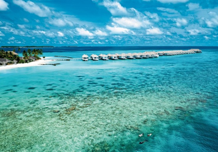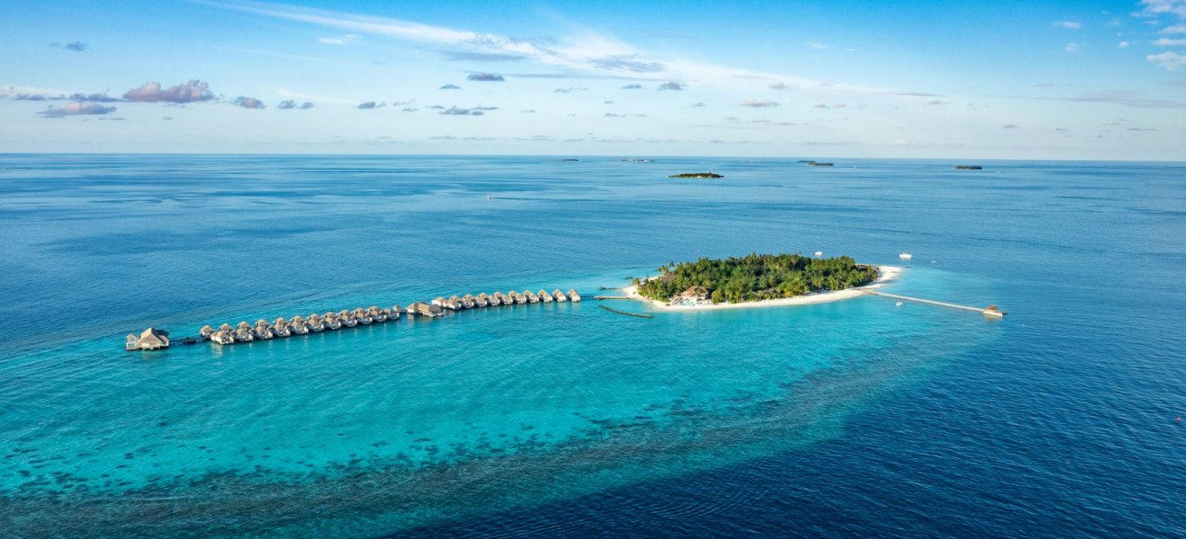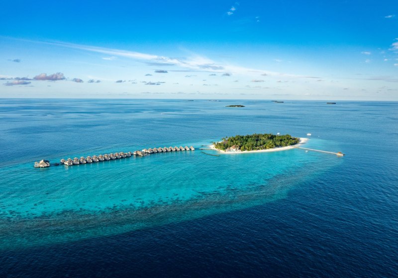 Das Resort liegt auf Maagau Island im Dhaalu Atoll – direkt am feinen Sandstrand, umspült von einer ruhigen Lagune. Ihr blickt über Wasserflächen, die sich farblich verändern, je nach Licht und Tageszeit. Highlight: Wasser-Villen stehen auf Stelzen über der Lagune mit direktem Meerzugang.