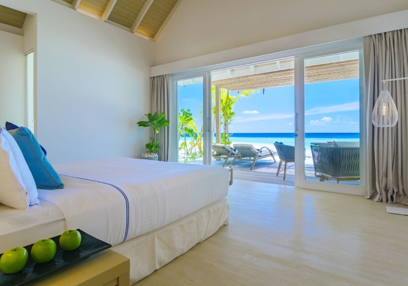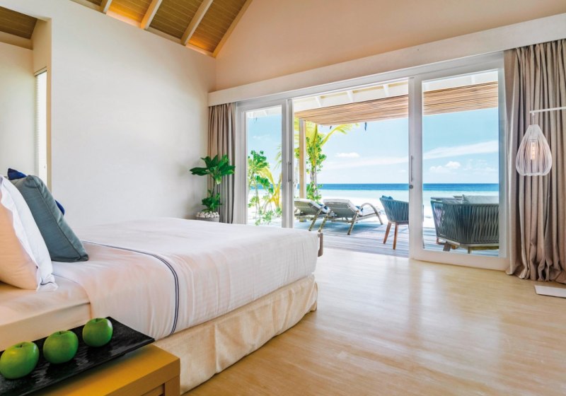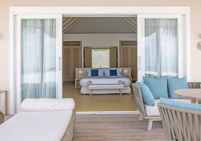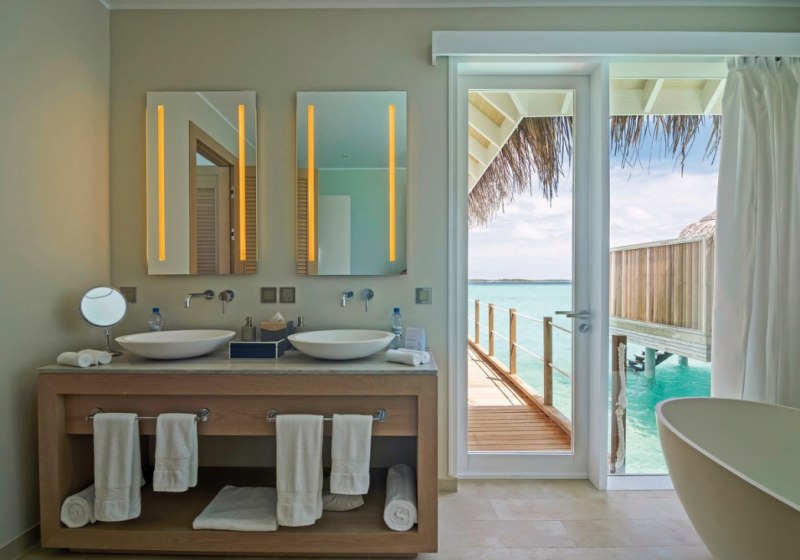96 Villen und Zimmer sind klar ausgestattet: Klimaanlage, WLAN, Sat-TV, Safe, Minibar sowie Kaffee- und Teezubereiter. Die Badezimmer bieten Badewanne und Regendusche, mit Bademänteln und Slippern. Highlight: Wasser-Villen auf Stelzen mit direktem Zugang ins Meer.