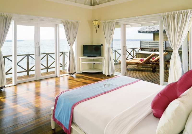 Die Ausstattung ist praxisnah: Klimaanlage, TV, Safe, Minibar und F f6hn. Je nach Kategorie erwartet Euch ein halboffenes Bad mit Badewanne und Au dfendusche. Die Reef Villen stehen auf Stelzen fcber dem Wasser und verbinden den Innenbereich mit der Lagune in direkter Sicht- und N e4he.
