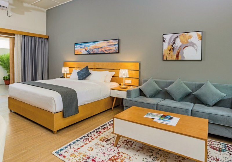 • Klimaanlage • Wecker • Kühlschrank • Haartrockner • Sitzecke (je nach Zimmerkategorie) • Minibar • Telefon • Safe • Meerblick (je nach Zimmerkategorie) • Kaffee-/Teezubereiter • Fernseher (Sat-TV) • Ventilator • WiFi • Balkon oder Terrasse • Gartenblick • Poolblick • Strandblick • Holz/Parkett • Balkon (je nach Zimmerkategorie) • Terrasse