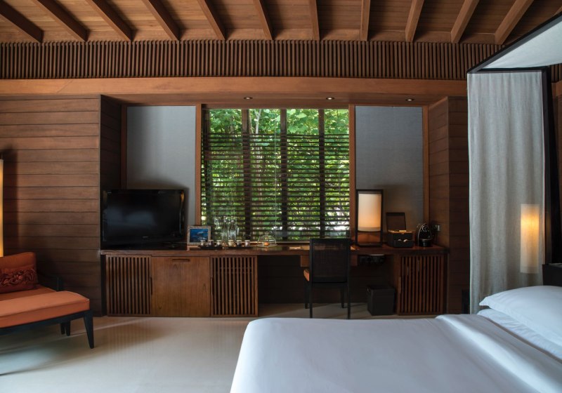 Die 51 Villen setzen auf natürliche Materialien und klare Linien. Badezimmer mit Innen- und Außendusche sowie Badewanne schaffen Raum, Klimaanlage und Ventilator regulieren das Klima. Unterhaltung liefert der LCD-TV mit CD-/DVD-Player und iPod-Dockingstation, dazu In-Room iPad und WLAN. Highlight: Großzügige Bäder mit Innen- und Außendusche.