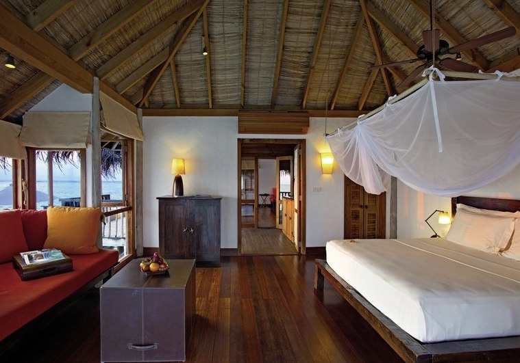 Alle Villen stehen auf Stelzen über der Lagune. Ein klimatisierter Schlafraum mit Kingsize-Bett trifft auf einen separaten Wohnbereich mit Sitz- und Esszone. Das halb offene Bad bietet Badewanne und separate Dusche. Auf Eurem Sonnendeck steigt Ihr direkt in die Lagune. Highlight: Große Dachterrasse erweitert den privaten Außenraum.