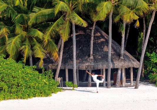 Das Meera Spa steht über dem Wasser und zeigt Glasfenster im Boden – Ihr blickt während der Behandlung auf die Lagune. Sauna und Dampfbad flankieren das Angebot, Yoga setzt entspannte Akzente im Tageslauf. Highlight: Overwater-Setting mit Einblick durch Glasboden.