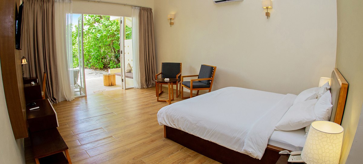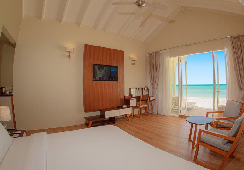 Ihr wohnt in freistehenden Beach-Bungalows im nordöstlichen Strandbereich – mit Terrasse zur Meerseite und direktem Zugang zum Sand. Das halb-offene Bad bietet Regendusche und WC, dazu Föhn. Im Wohnbereich findet Ihr Klimaanlage, Sat-TV, Telefon und Safe; Minibar gegen Gebühr sowie Kaffee-/Teezubereiter stehen bereit.