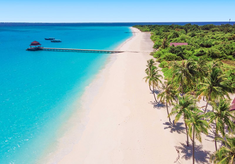 - Inselweite Lage: Koralleninsel mit weißem Strand und Lagune schafft großzügige Weite.