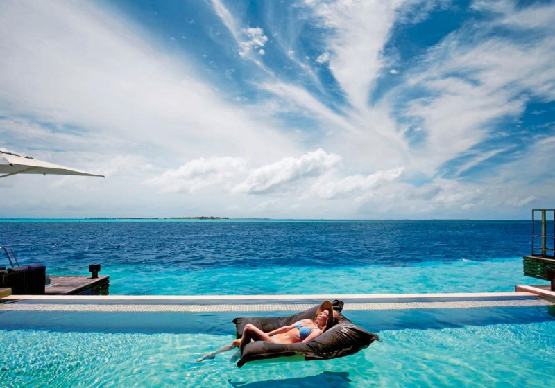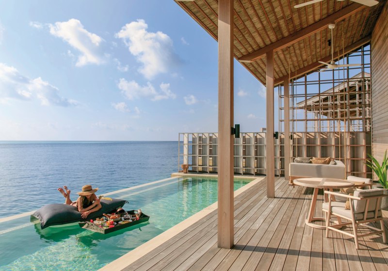 Nur 15 Overwater-Residenzen bilden das Wohnangebot: 13 One Bedroom Ocean Pool Residences mit etwa 300 Quadratmetern und 2 Two Bedroom Ocean Pool Residences mit etwa 380 Quadratmetern. Jede Einheit liegt auf Stelzen über der Lagune, mit möblierter Terrasse, direktem Meerzugang und einem privaten Infinity-Pool von circa 44 Quadratmetern.