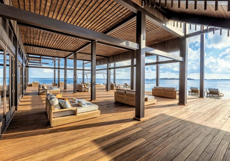 - Retreat auf Stelzen: Offene Wege und Lagunenblick prägen die öffentlichen Bereiche.