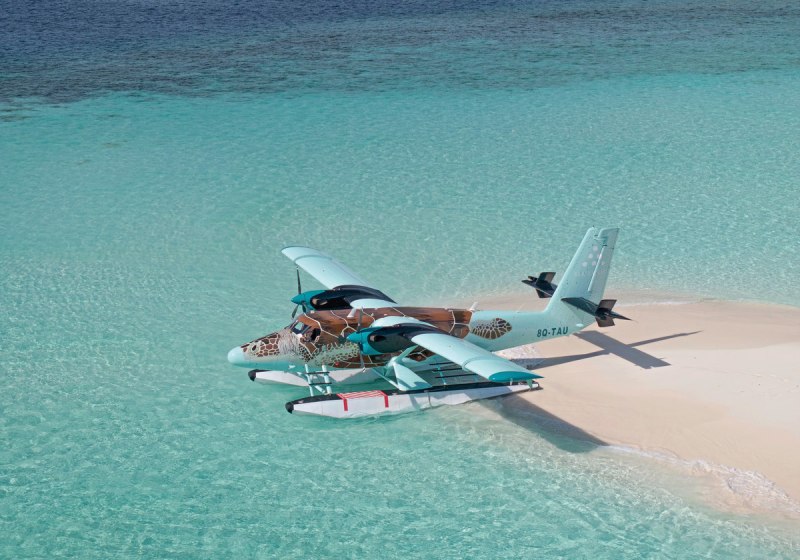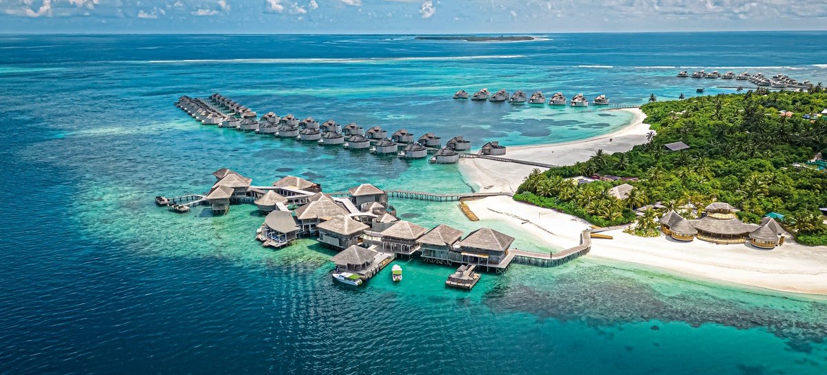 Ihr reist per Wasserflugzeug an; die Transferzeit beträgt etwa 65 Minuten. Das Resort befindet sich auf Olhuveli im Laamu-Atoll, auf einer privaten Insel mit feinsandigem Strand. Das Hausriff liegt je nach Stelle rund 5 bis 100 Meter entfernt – ideal für kurze Wege zum Schnorcheln.