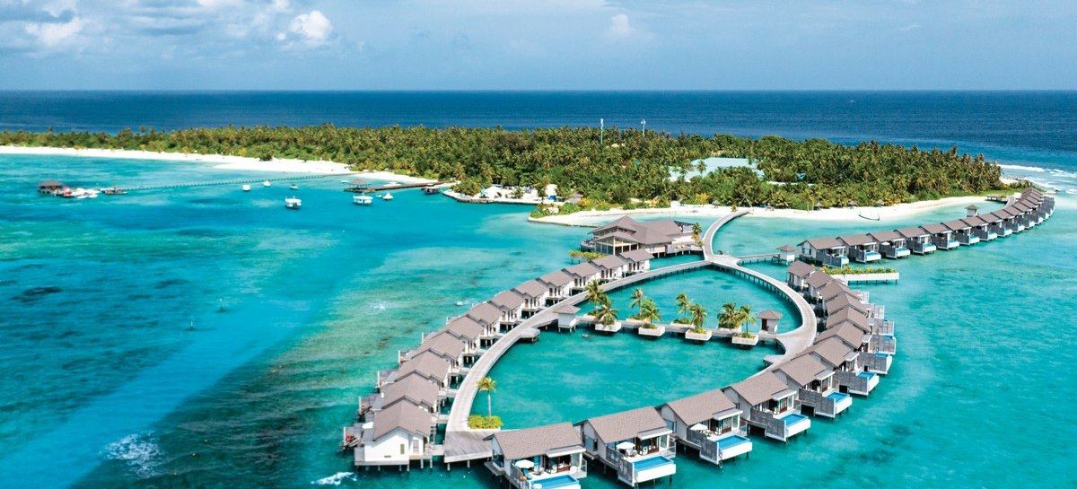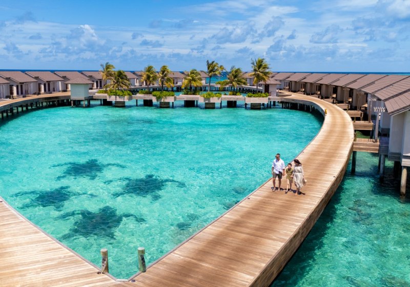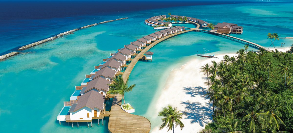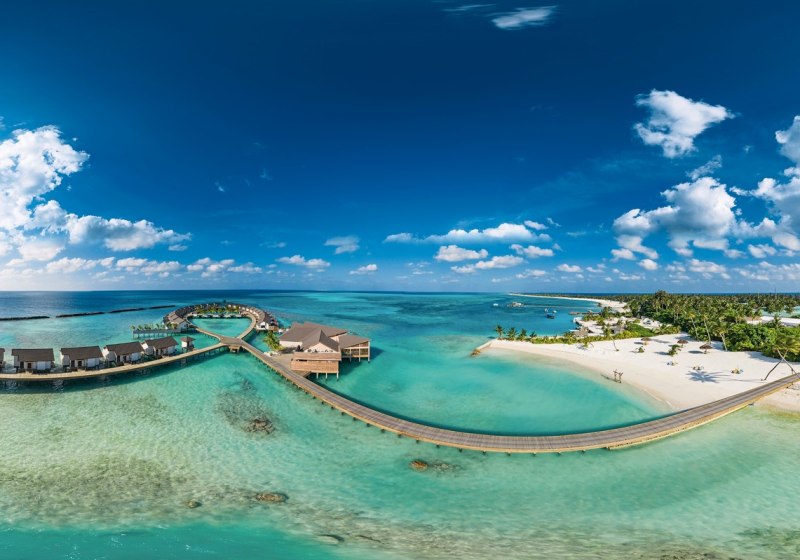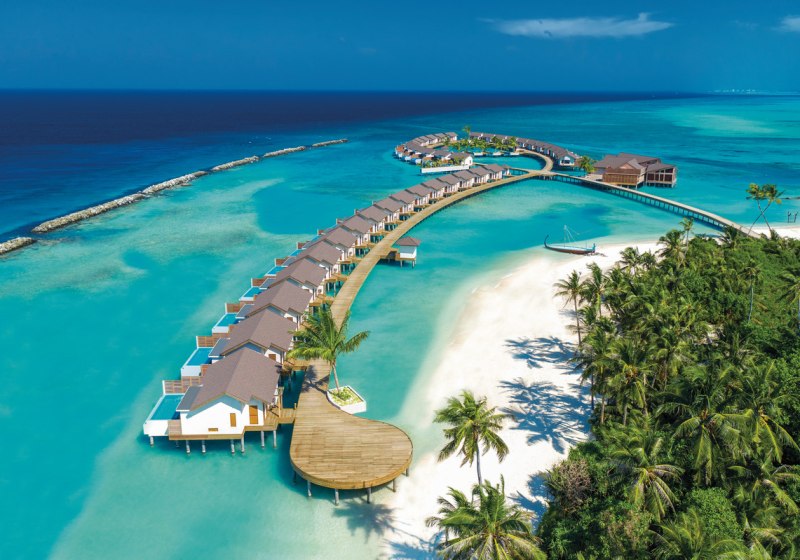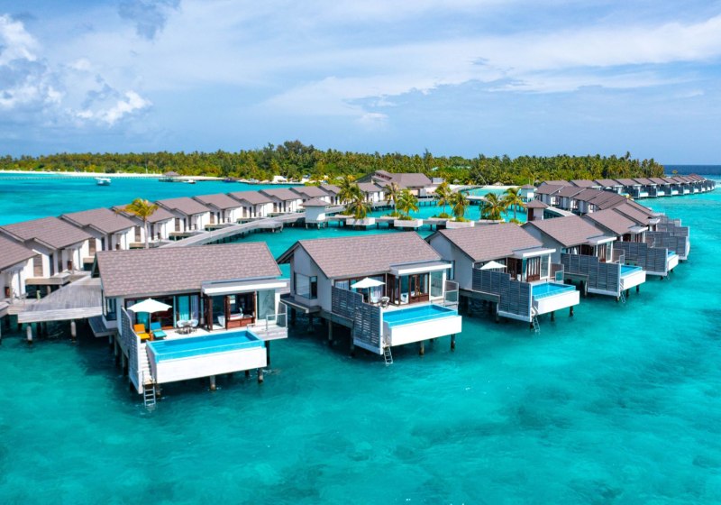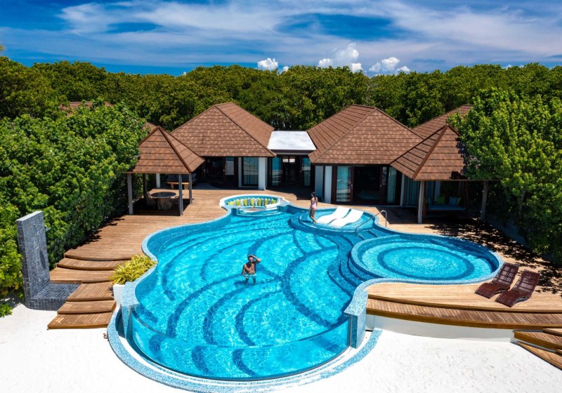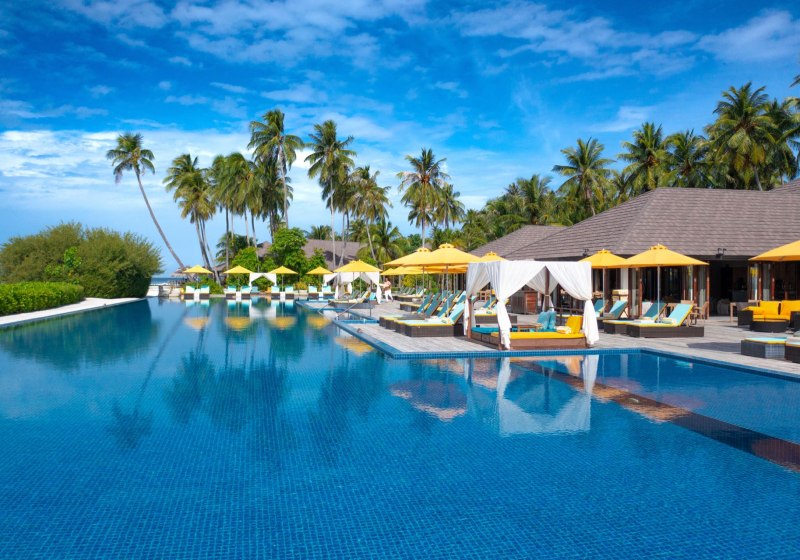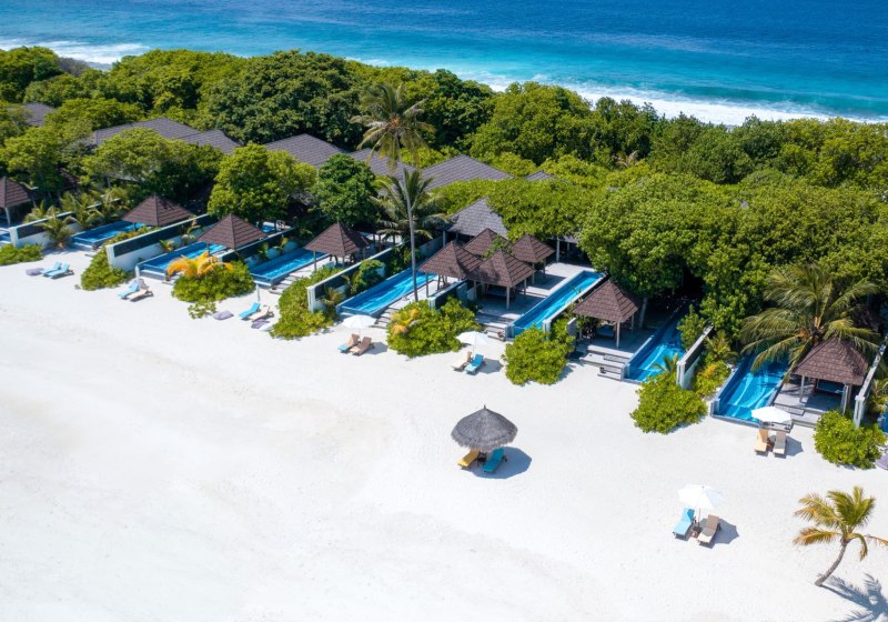 Die Infrastruktur ist großzügig und klar gegliedert: 162 freistehende Villen und Suiten, Rezeption, Clubhaus, Tauchschule und Bootsanleger. WLAN steht im gesamten Resort bereit. Der große Hauptpool erstreckt sich bis 50 Meter und wird von einer Poolbar flankiert; ein separater Adults-only-Pool ergänzt das Angebot. Highlight: Großzügiger Hauptpool mit Länge bis 50 Meter.