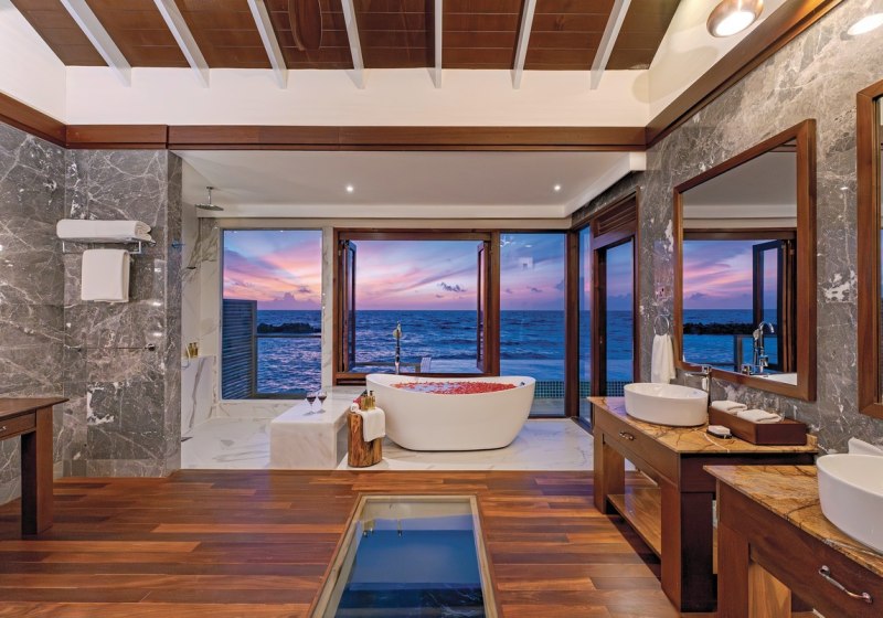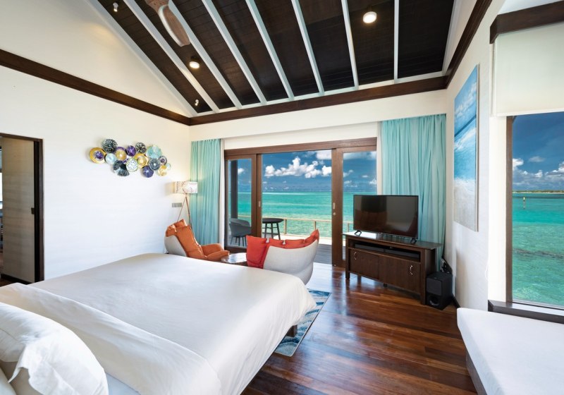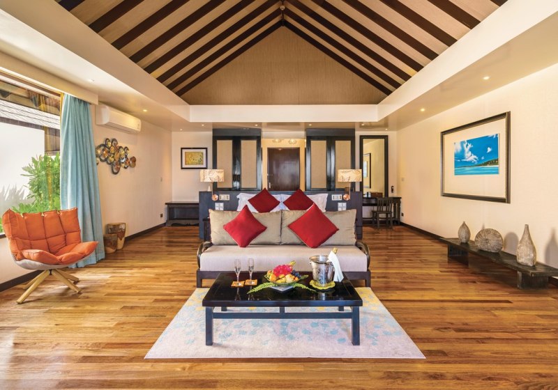 Die Beach Villen bieten etwa 100 Quadratmeter Raumgefühl, ein Open-Air-Bad mit Whirlpool und direkten Zugang zu Strand oder Gartenbereichen. Water Villen stehen mit ca. 105 Quadratmetern auf Stelzen über der Lagune, mit direktem Meerzugang und optionalem Sonnenuntergangsblick. Highlight: Overwater-Villen mit unkompliziertem Einstieg in die Lagune.