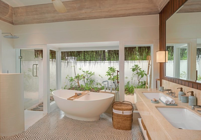 Ihr wohnt in Bungalows und Villen mit Klimaanlage, Sat-TV, Telefon und kostenfreiem WLAN. Die halboffenen Bäder kombinieren Badewanne, WC und separate Außendusche; dazu kommen Föhn, Bademäntel und Slipper. Jede Einheit besitzt eine Veranda – ein stiller Ort für den Tagesausklang.