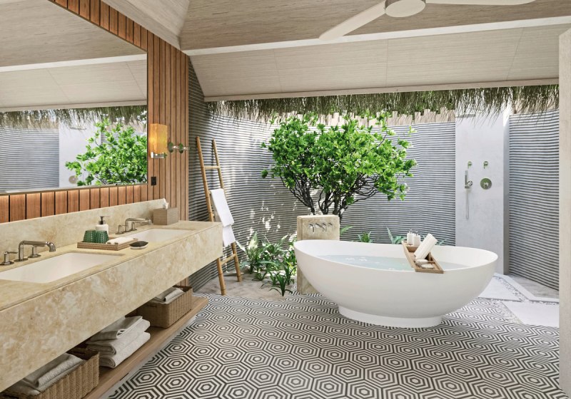 - Halboffenes Bad: Außendusche und Wanne verbinden Frischluft und Komfort überzeugend.