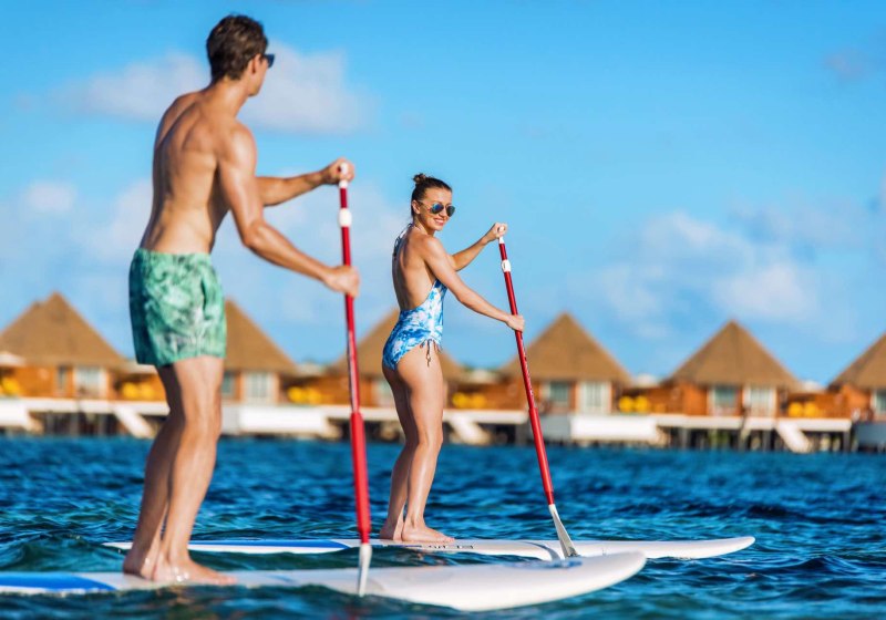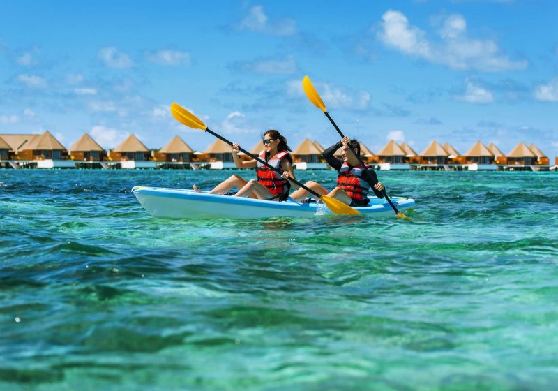 Aktive starten im Fitnesscenter oder auf dem Tennisplatz, wechseln dann aufs Wasser: Kayak, Stand-up-Paddling und Tretboot sind die ruhigen Optionen. Mehr Tempo bringen Jetski und Windsurfen gegen Gebühr. Mit der PADI Tauchschule öffnet sich die Unterwasserwelt des Atolls, während Schnorchelausrüstung (gegen Gebühr) die Lagune vor der Tür zugänglich macht—kurzer Weg, großer Effekt.