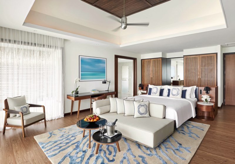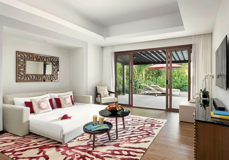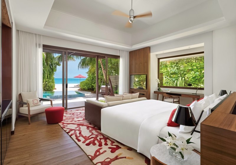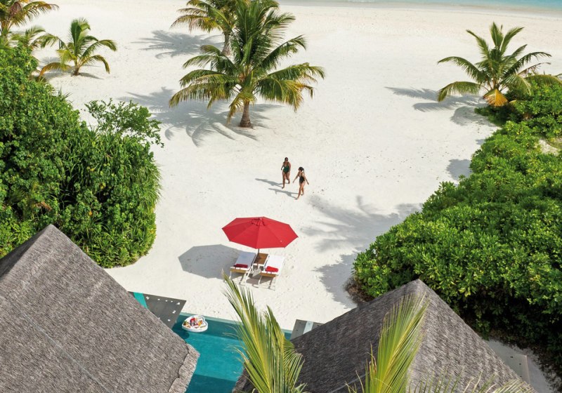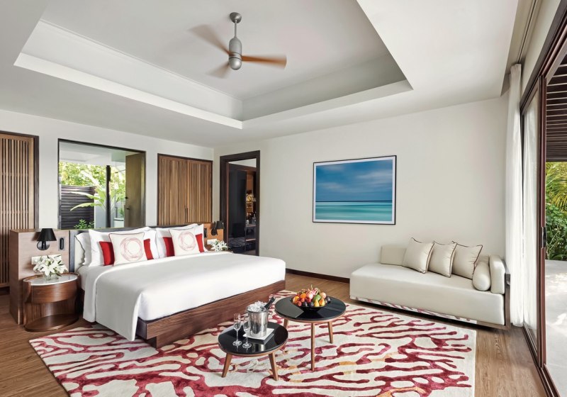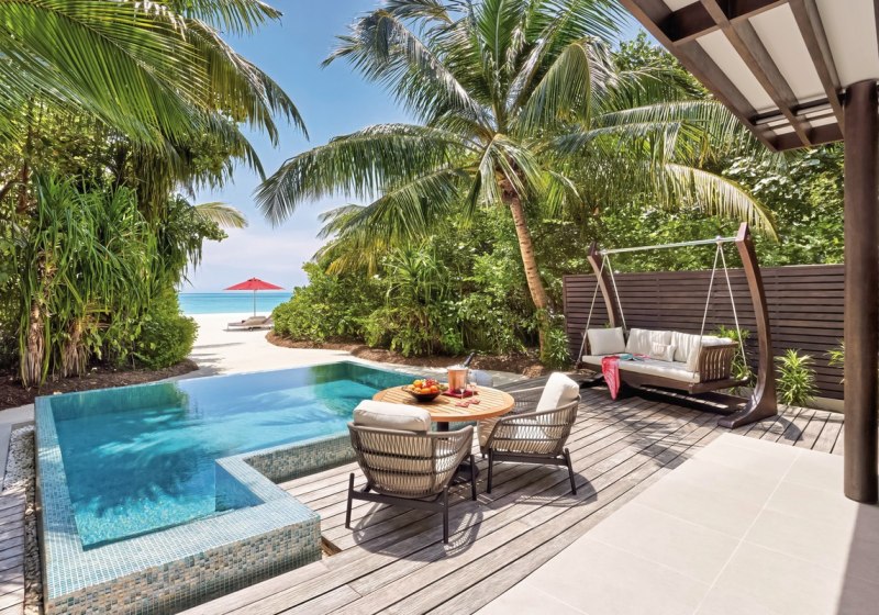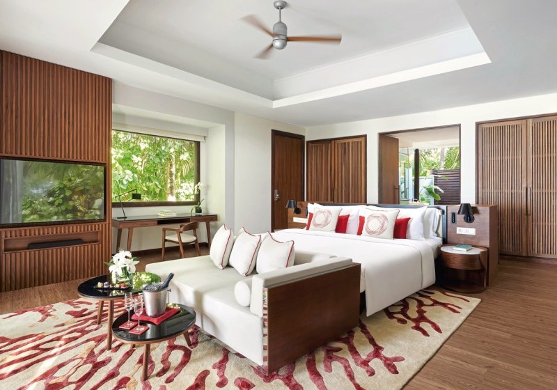 Die Beach Villen starten bei ca. 135 m² und bieten halboffenes Bad mit freistehender Wanne, Außendusche und privatem Garten. Klimaanlage, TV mit Bose Surround-System, Safe, Minibar sowie Kaffee- und Espressomaschine gehören ebenso dazu wie eine Popcornmaschine für Euren Filmabend.