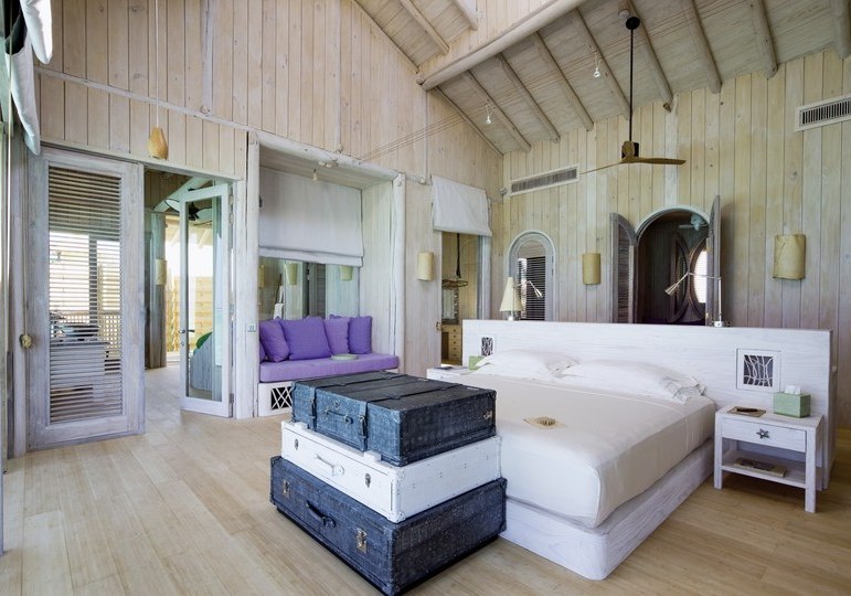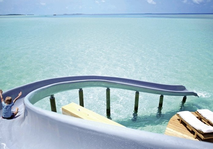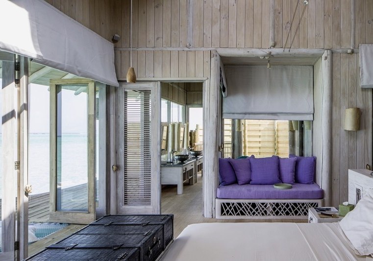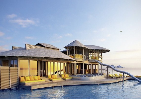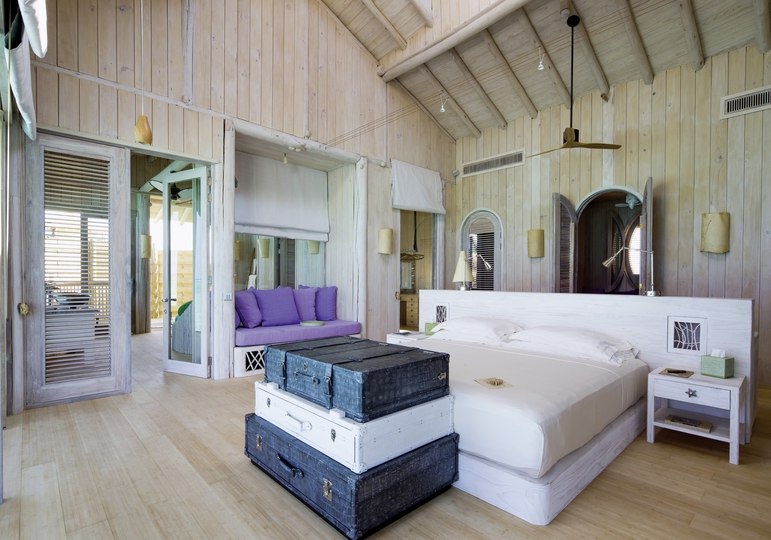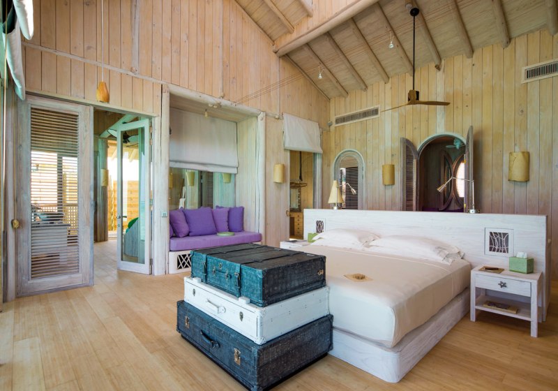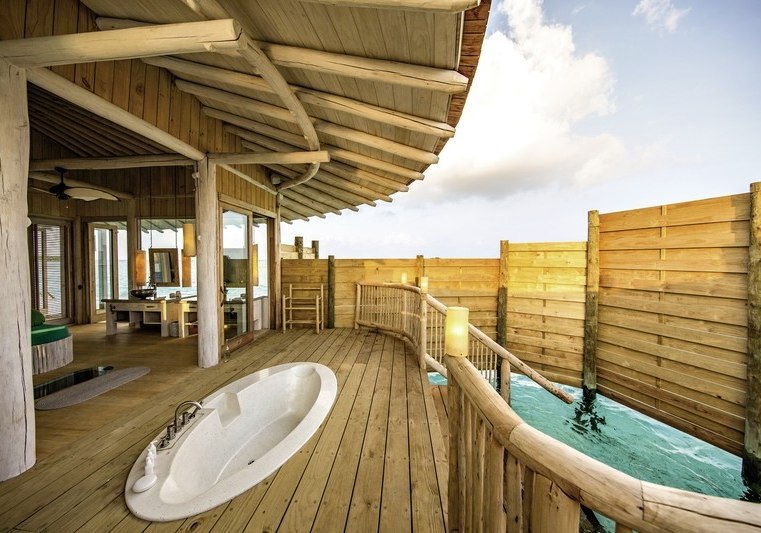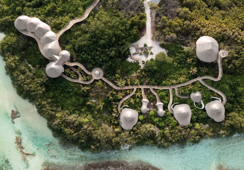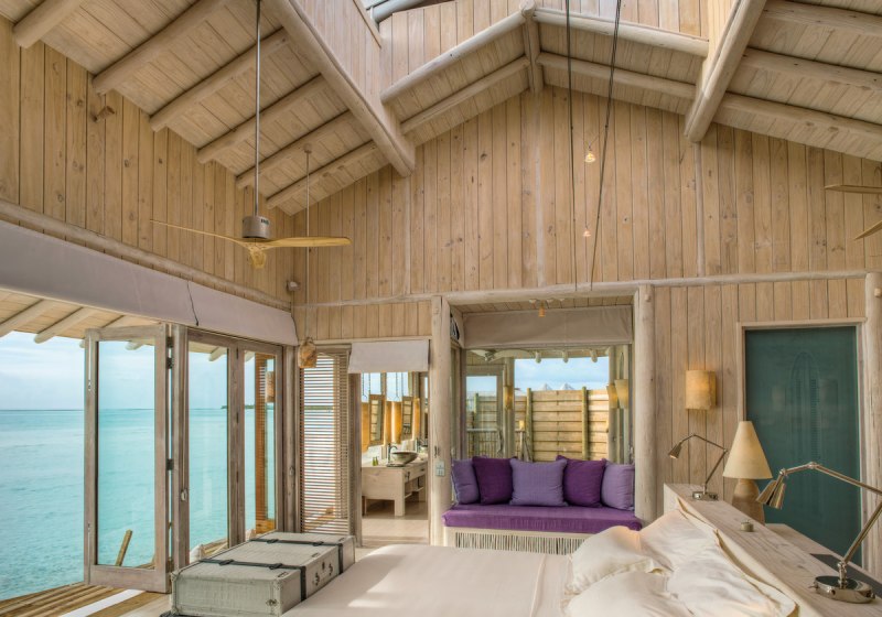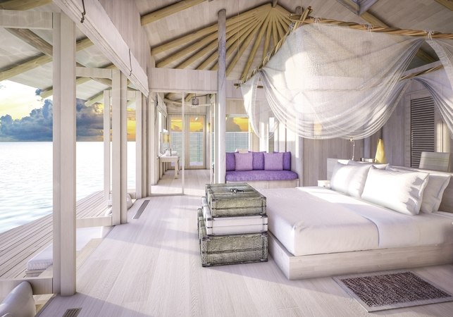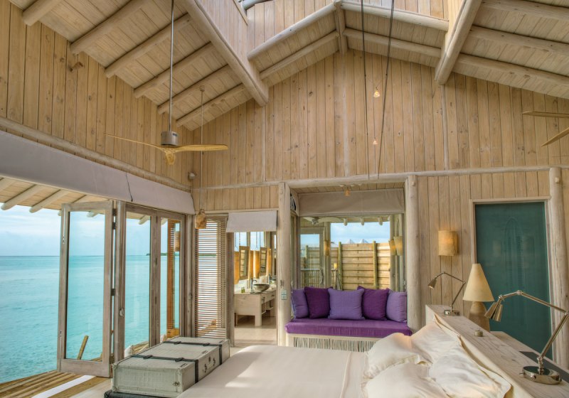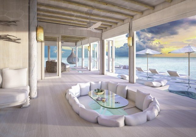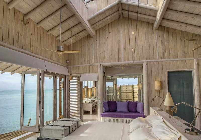 Die 54 Villen sind als Wasserbungalows auf Stelzen konzipiert – mit Wohn- und Schlafbereich, Terrasse und direktem Zugang zur Lagune. Markant sind private Pools und Rutschen, ergänzt um ein elektrisch aufklappbares Dach zur Sternenbeobachtung. Open-Air-Lagunenbad und Außendusche unterstreichen die Nähe zum Wasser.