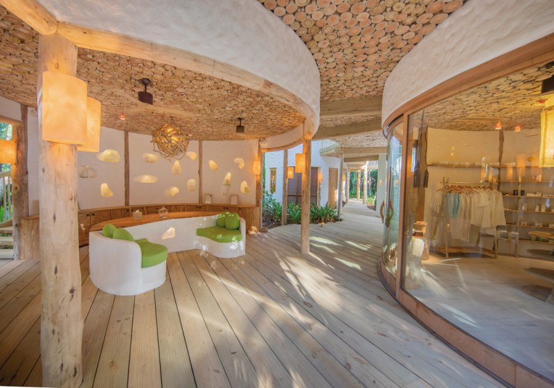 Die öffentlichen Bereiche sind weitläufig organisiert: Stege, Bars, Lounge-Zonen und stille Ecken fügen sich in die Lagunenlandschaft. Ein Tauchcenter, Boutique, Galerie und Bibliothek bilden die inhaltliche Klammer, ergänzt von organischen Gärten für Kräuter und Gemüse sowie einem Labyrinth zur Meditation.