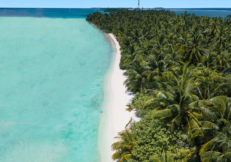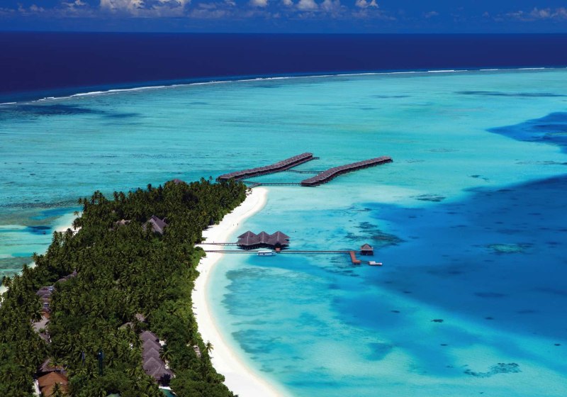 Ihr wohnt auf einer etwa 1000 mal 200 Meter großen Insel im Meemu-Atoll. Das Außenriff liegt nur rund 500 bis 600 Meter vom Strand entfernt, die Lagune öffnet weite, ruhige Wasserflächen. Die Überfahrt vom Flughafen Hulhule erfolgt per Schnellboot und dauert ungefähr zweieinhalb Stunden. Vor Ort erwartet Euch unmittelbarer Strandzugang mit kurzen Wegen zwischen Villa, Pool und Meer.