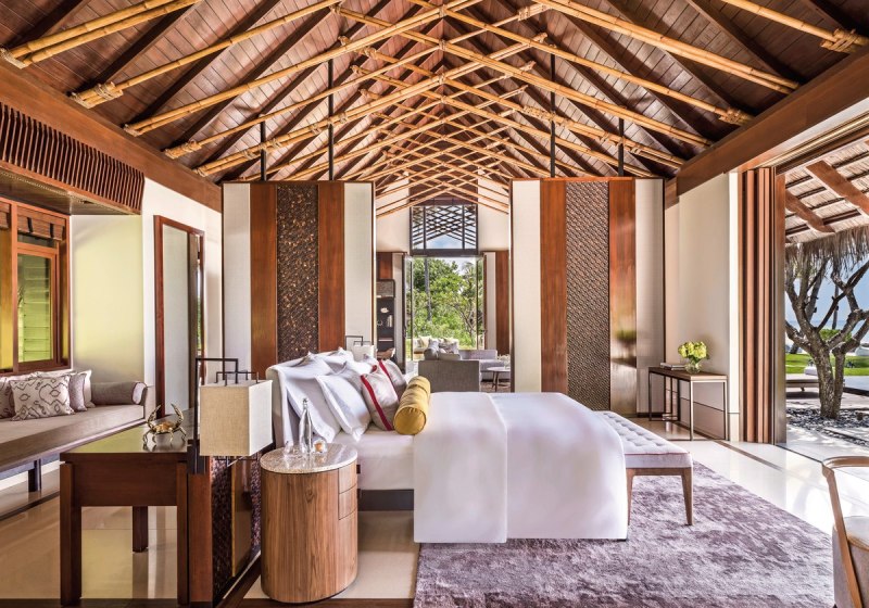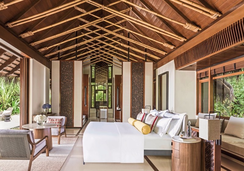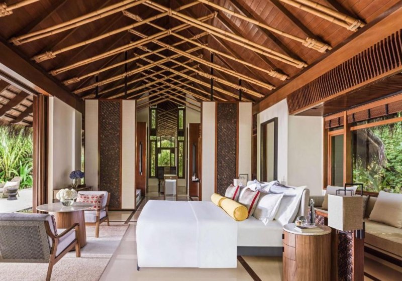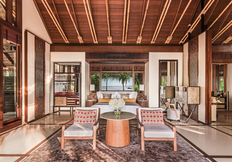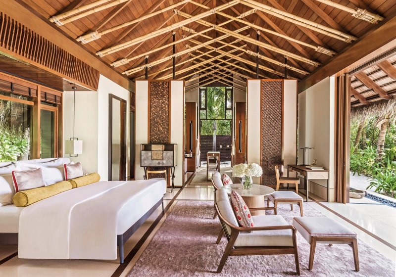 Die Beach Villas (etwa 185 m²) bieten King- oder Queen-Size-Betten, ein Bad mit großer Terrazzo-Badewanne, Regendusche und zusätzlicher Außendusche. Eine private Terrasse mit Liegestühlen verbindet Innen- und Außenbereich. Bodentiefe Fenster öffnen den Blick in die Umgebung und bringen viel Licht in den Raum. Ausstattung wie Minibar, Safe, Kaffee- und Teezubereiter sowie WiFi schafft Verlässlichkeit im Alltag.