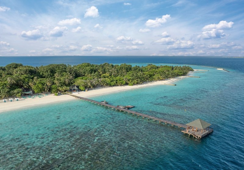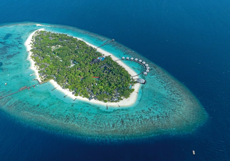 Ihr wohnt im Raa‑Atoll auf einer Insel von etwa 750 mal 290 Metern. Der Sandstrand zieht sich rund zwei Kilometer, sodass Ihr immer einen ruhigen Abschnitt findet. Das Hausriff liegt je nach Punkt etwa 80 bis 250 Meter entfernt und ist damit schnell erreicht. Der Transfer ab Malé erfolgt per Wasserflugzeug in rund 45 Minuten oder alternativ per Inlandsflug und Speedboat in etwa 20 plus 40 bis 45 Minuten.
