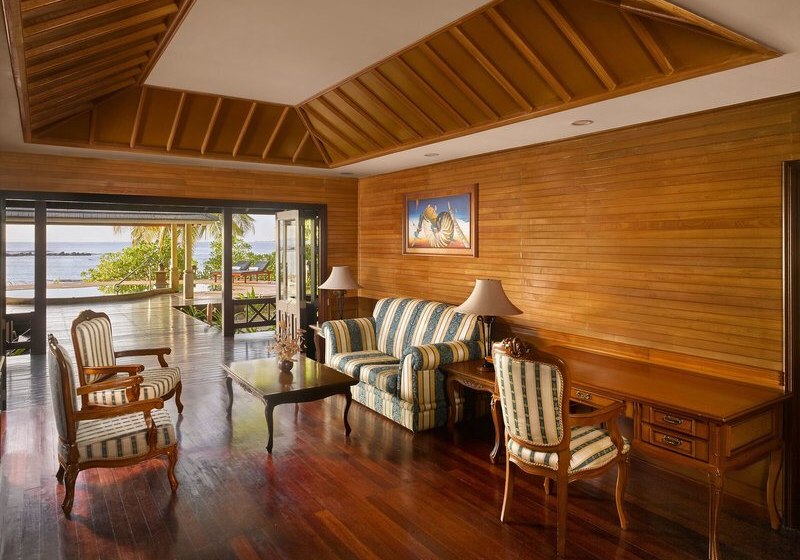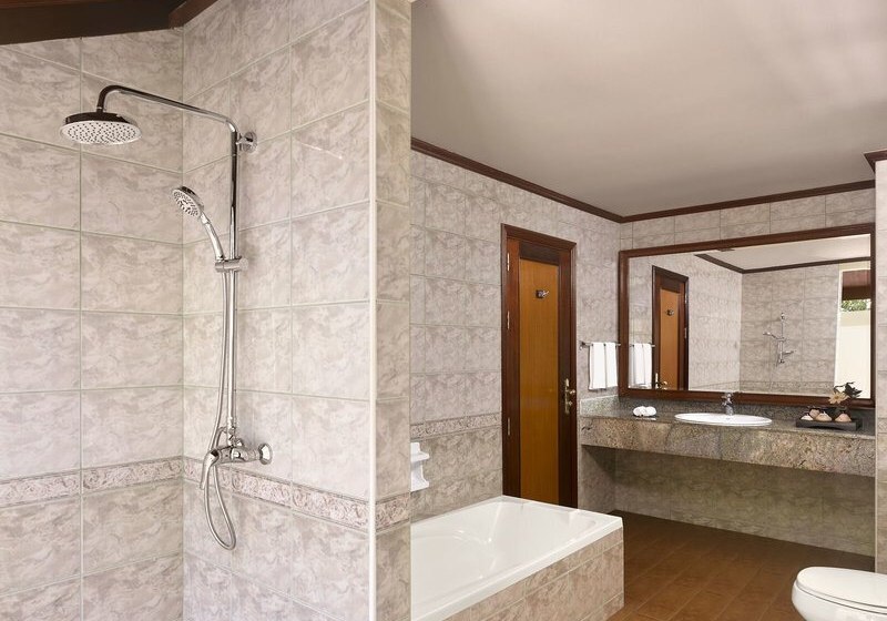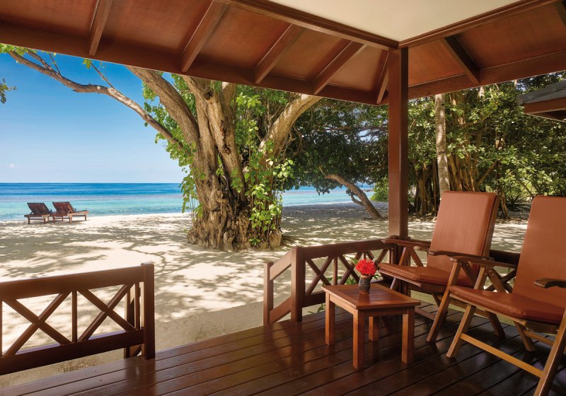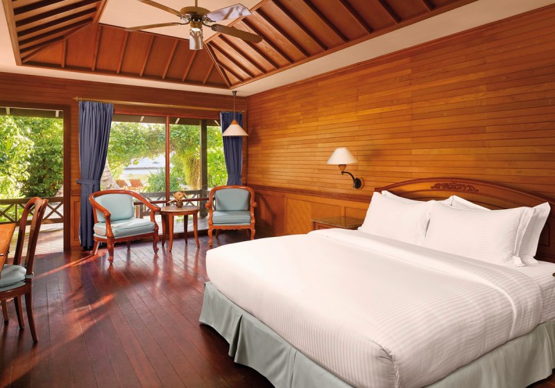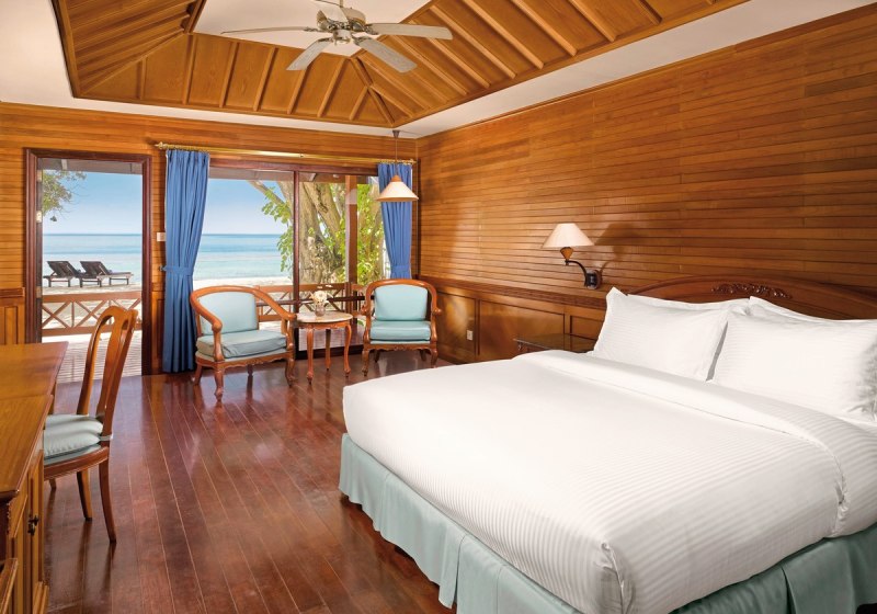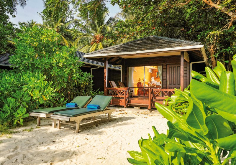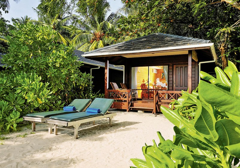 Ihr wohnt in Strandvillen mit etwa 50 Quadratmetern inklusive Außenbereich, halb offenem Bad mit Badewanne, Dusche/WC und separater Außendusche. Zur Ausstattung zählen Föhn, Telefon, Klimaanlage, Sat-TV, Safe, Sitzecke, Kaffee-/Teezubereiter, möblierte Terrasse; die Minibar ist gebührenpflichtig. WLAN steht in den Gästezimmern bereit. Highlight: Halboffenes Bad mit zusätzlicher Außendusche.