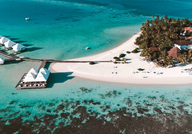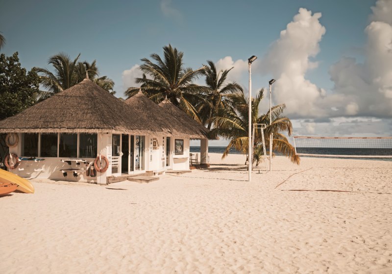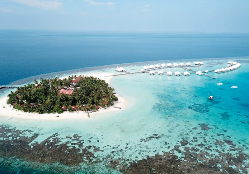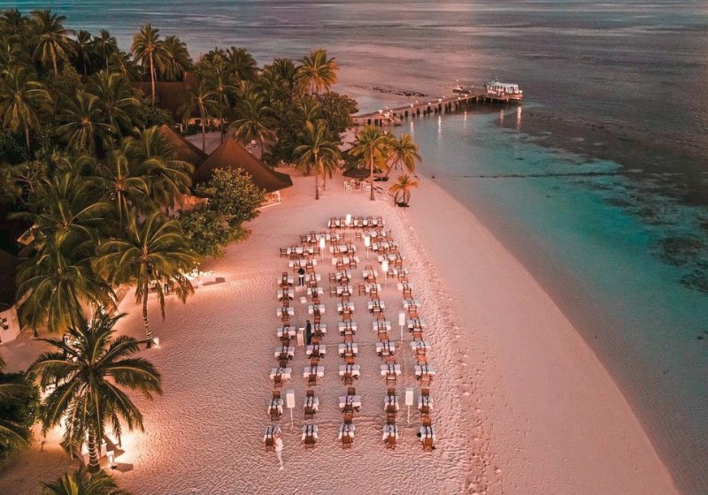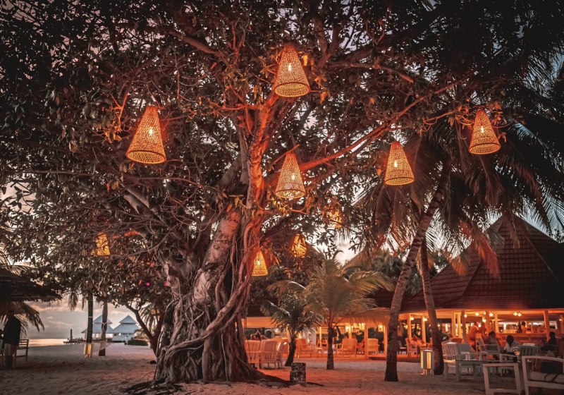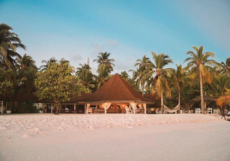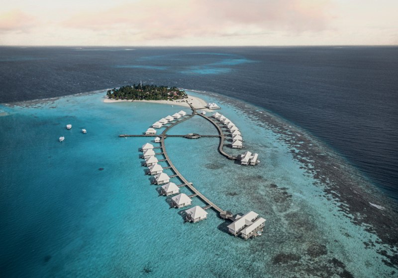 Die Insel im Ari-Atoll liegt direkt am feinsandigen Strand und wird in etwa 25 Minuten per Wasserflugzeug vom internationalen Flughafen erreicht. Dieser kurze Transfer bringt Euch zügig an einen Ort, an dem Wege kurz bleiben und das Meer die Szenerie prägt. Orientierung fällt leicht: Ihr blickt auf Lagune und Riffzonen, während die Bungalows säuberlich entlang des Strandes liegen und die Wasser Villen über dem Ozean stehen. Das Over-Water-Restaurant setzt einen markanten Akzent über dem Wasser, die Boli Beachbar verankert das Inselleben am Strand. Dank der kompakten Struktur bewegt Ihr Euch entspannt zwischen Unterkunft, Restaurantbereichen, Bar, Lobby und Bibliothek. Die Insel wirkt dadurch überschaubar und alltagstauglich, ohne ihre maritime Weite einzubüßen – ideal, wenn Ihr den Fokus auf Strandtage, Wassersport und kulinarische Abende legt.