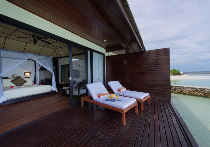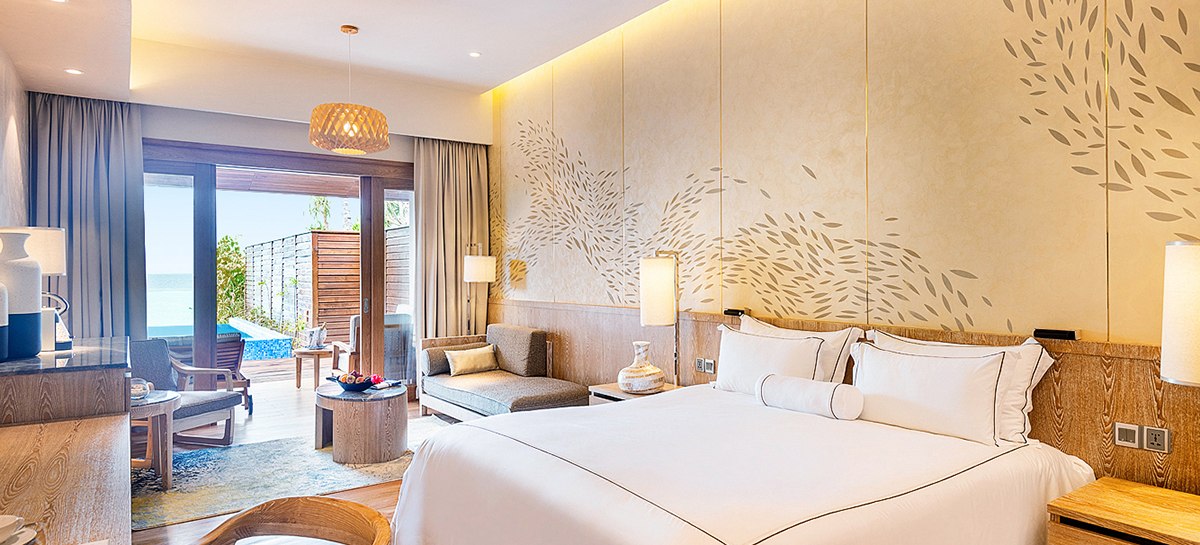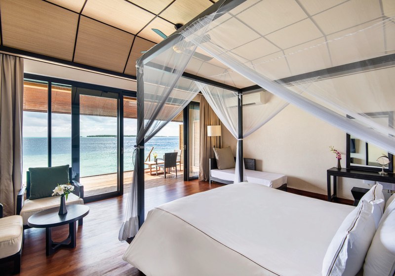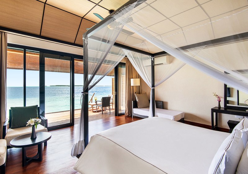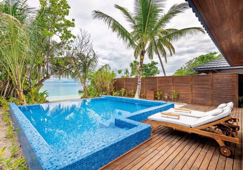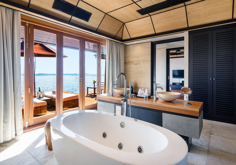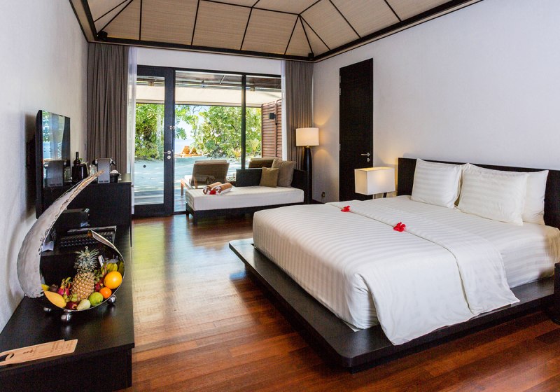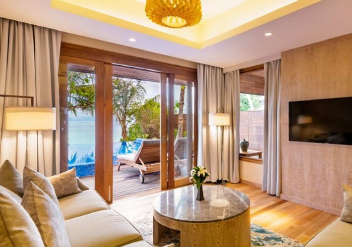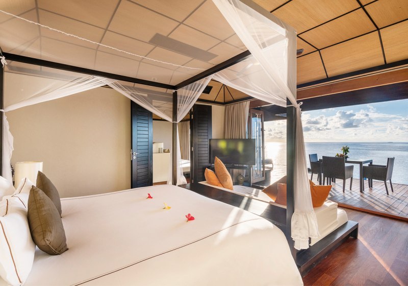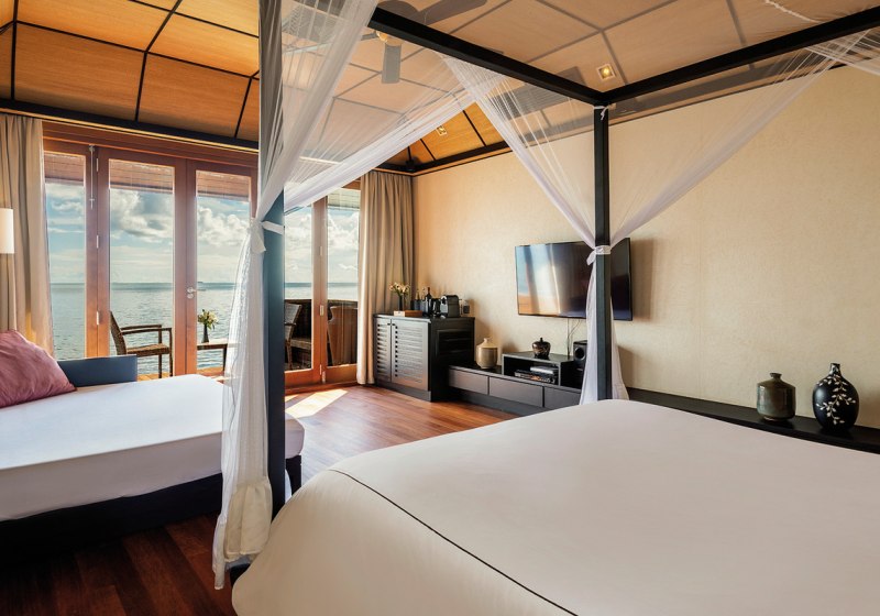 Die Deluxe Watervilla steht auf Stelzen über dem Meer, etwa 126 Quadratmeter groß, mit innenliegendem Bad, Glasboden und privater Sonnenterrasse mit kleinem Pool. Die Beach Suite liegt direkt am Strand und kombiniert private Terrasse mit Jacuzzi, direktem Meerzugang und 49"-Smart-TV; wahlweise als Variante mit Pool statt Jacuzzi.
