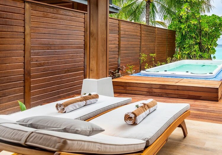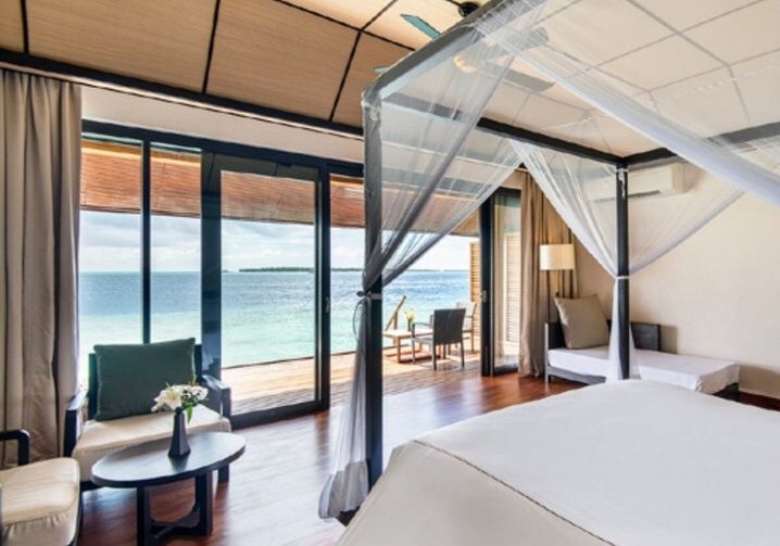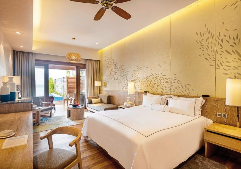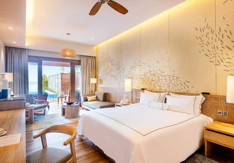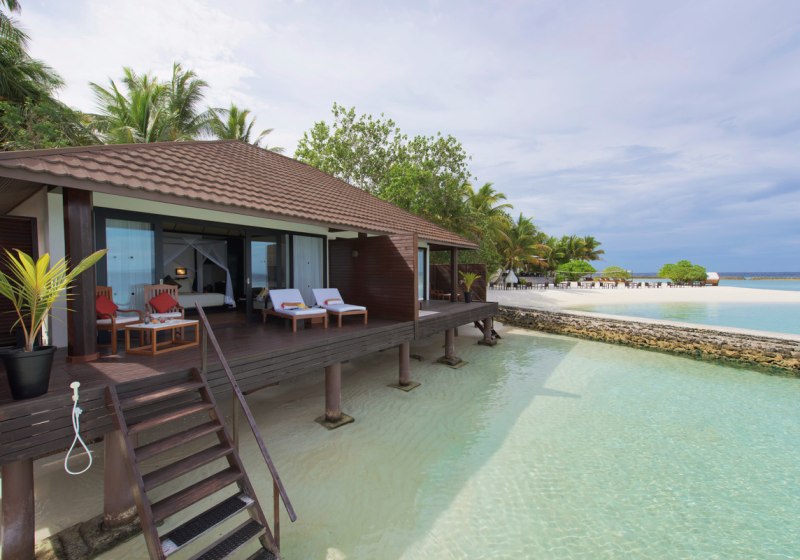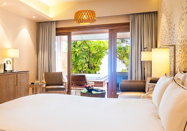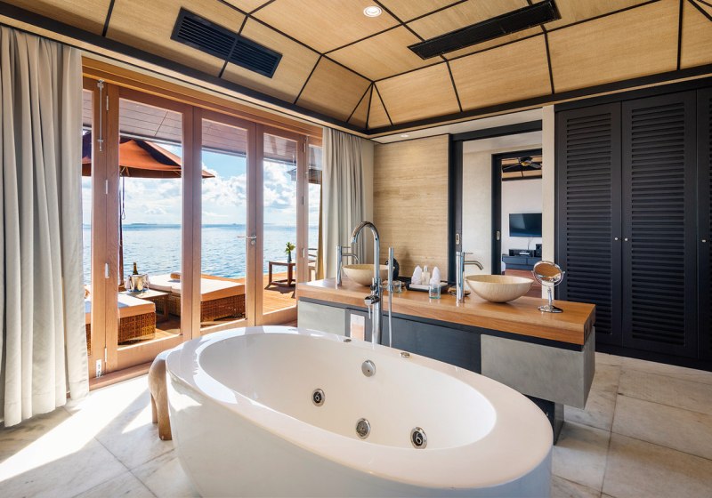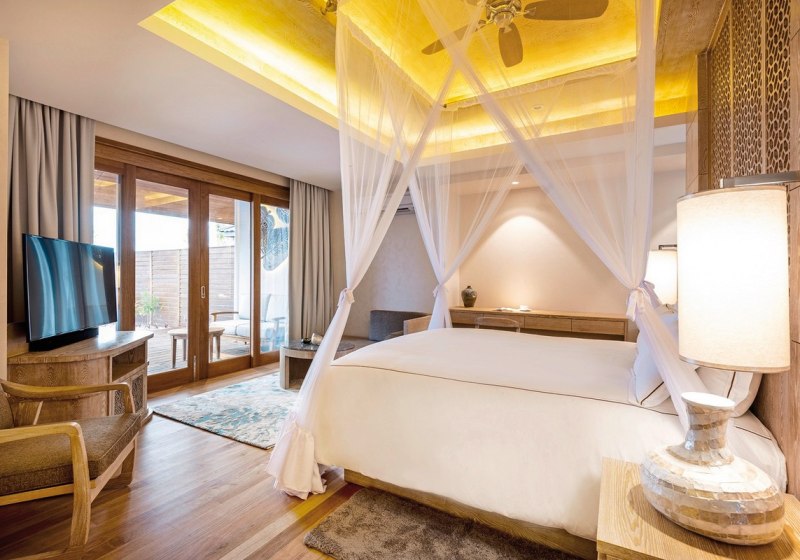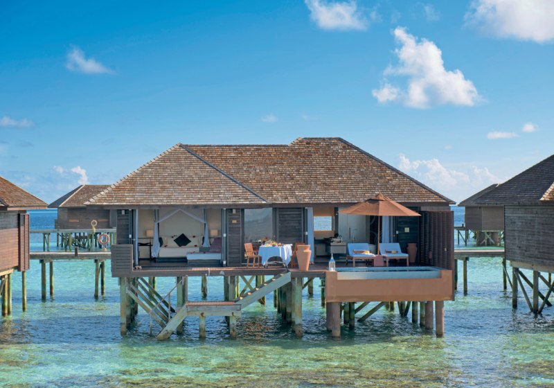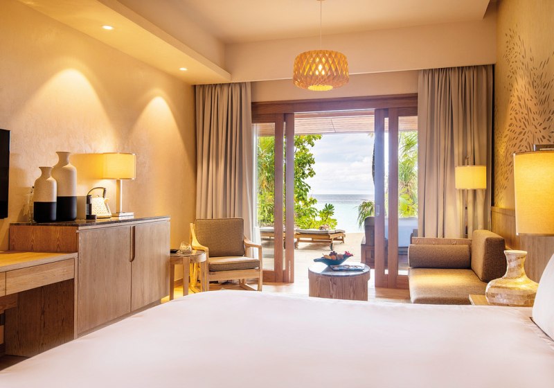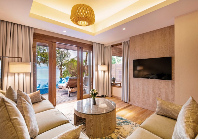 Die Deluxe Watervilla steht auf Stelzen über dem Meer, etwa 126 Quadratmeter groß, mit innenliegendem Bad, Glasboden und privater Sonnenterrasse mit kleinem Pool. Die Beach Suite liegt direkt am Strand und kombiniert private Terrasse mit Jacuzzi, direktem Meerzugang und 49"-Smart-TV; wahlweise als Variante mit Pool statt Jacuzzi.