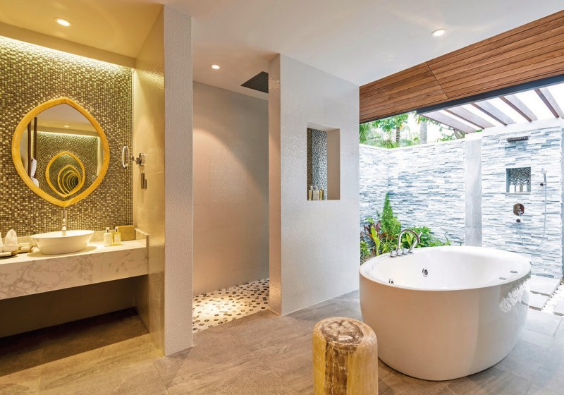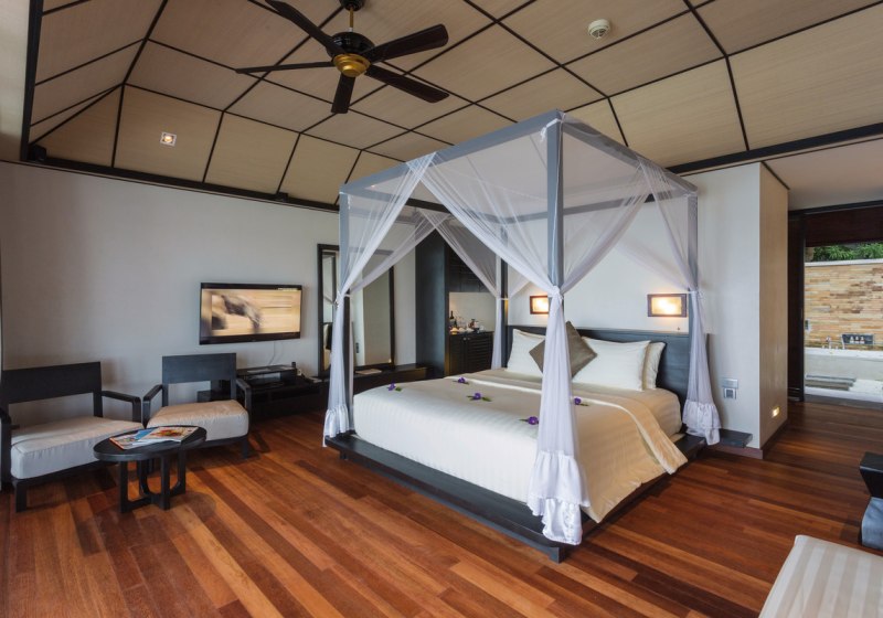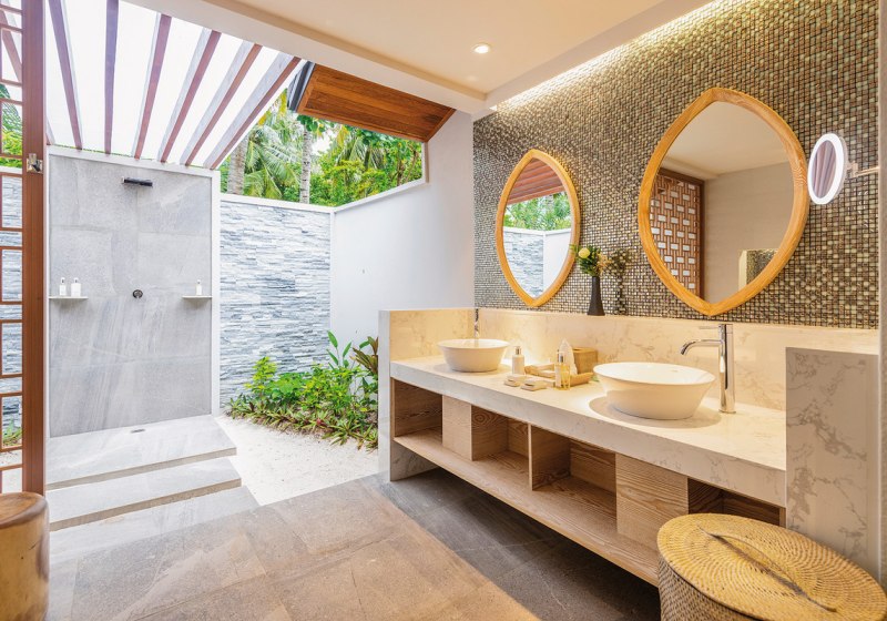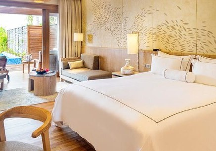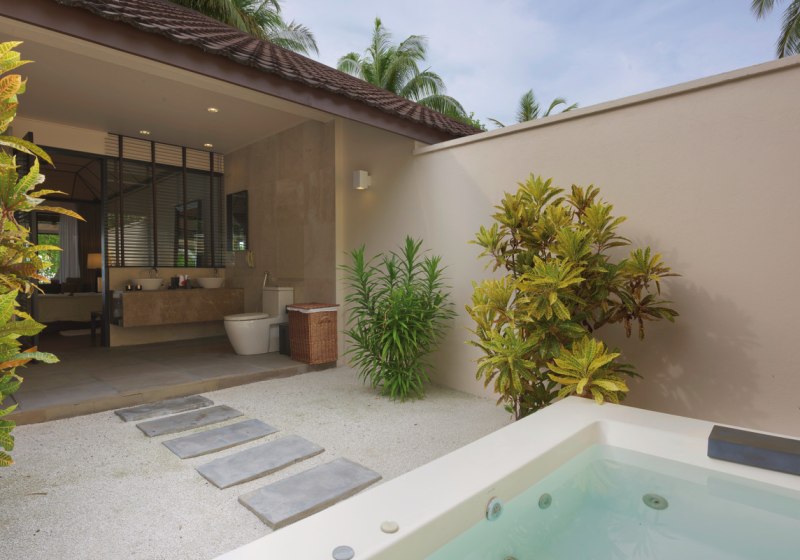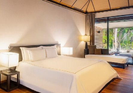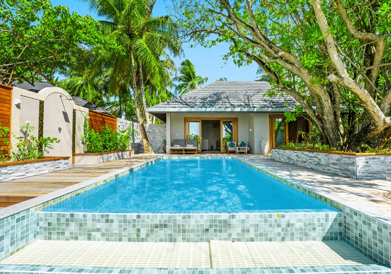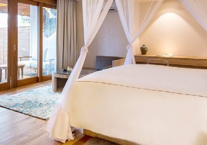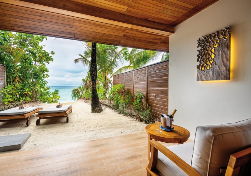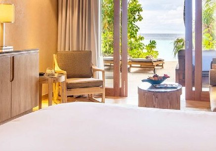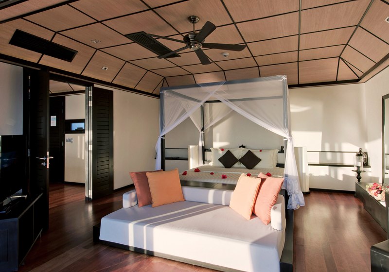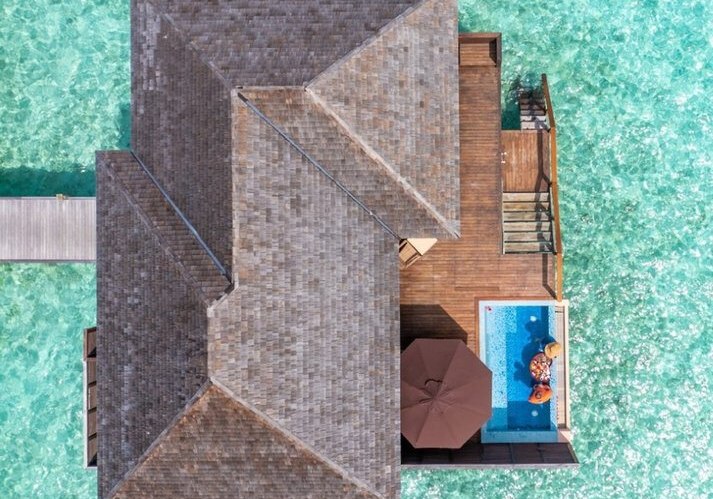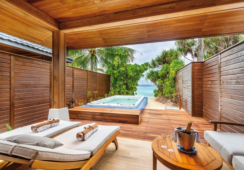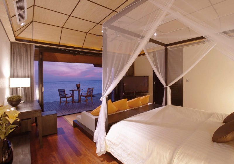 Die Deluxe Watervilla steht auf Stelzen über dem Meer, etwa 126 Quadratmeter groß, mit innenliegendem Bad, Glasboden und privater Sonnenterrasse mit kleinem Pool. Die Beach Suite liegt direkt am Strand und kombiniert private Terrasse mit Jacuzzi, direktem Meerzugang und 49"-Smart-TV; wahlweise als Variante mit Pool statt Jacuzzi.