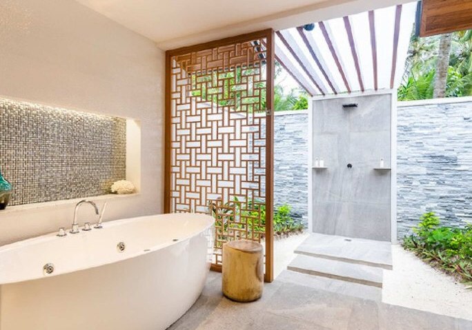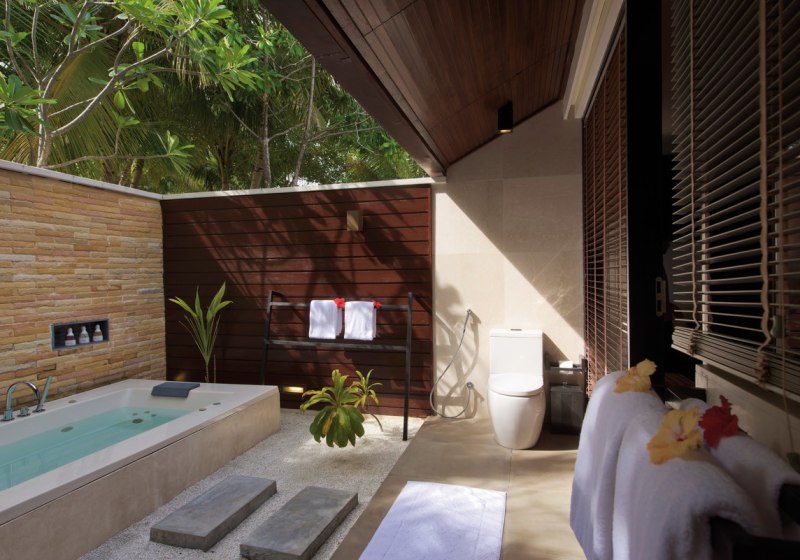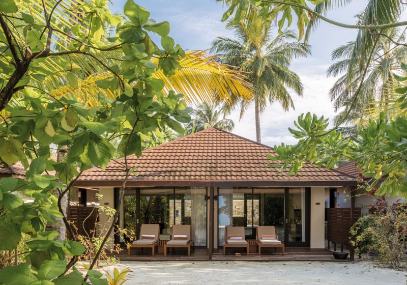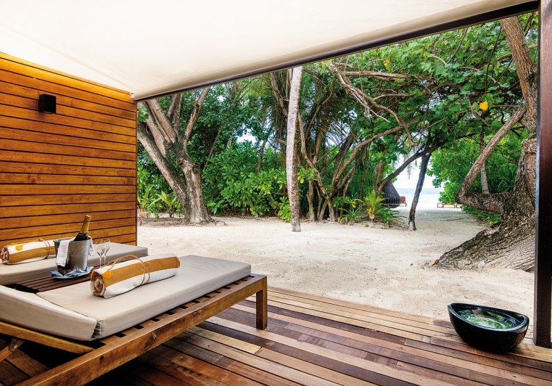 Ihr wählt zwischen Strand- und Überwasservillen mit klaren Stärken. Die Beach Villa bietet etwa 68 Quadratmeter, halboffenes Bad mit Außendusche und Whirlpool-Badewanne sowie Terrasse mit Sonnenliegen. Die Lagoon Villa misst rund 90 Quadratmeter und führt direkt ins Meer, ausgestattet wie die Beach Villa.