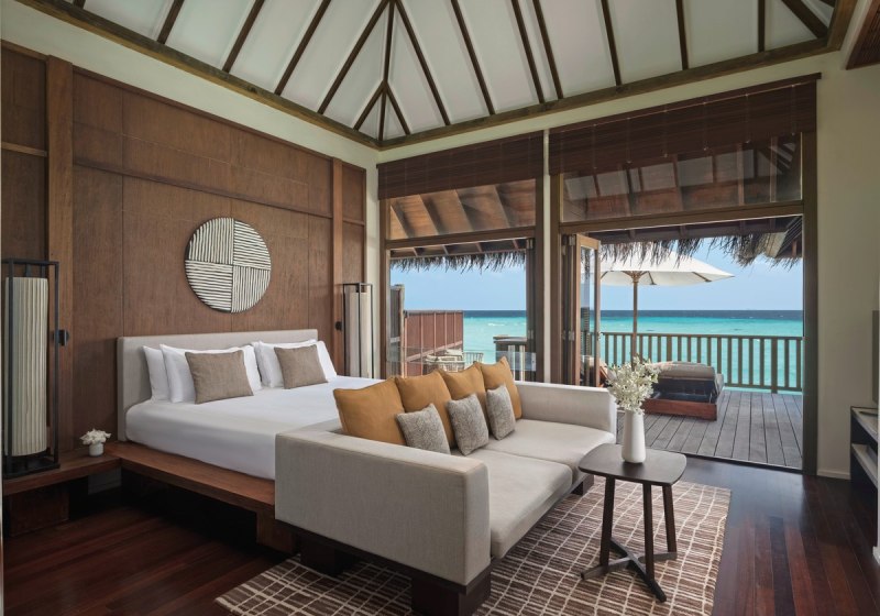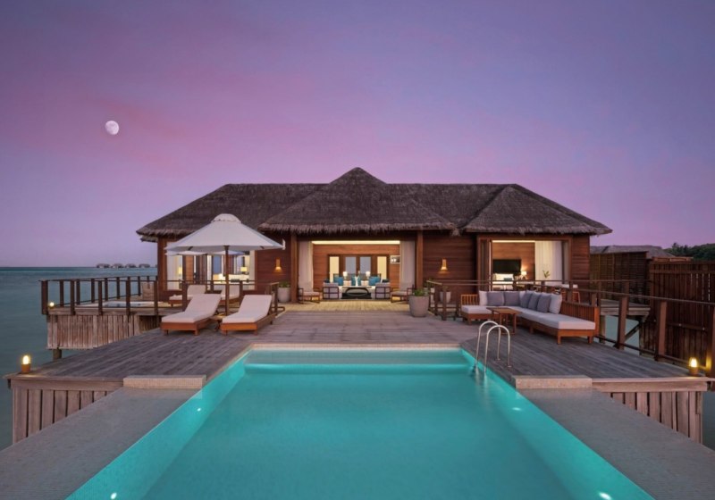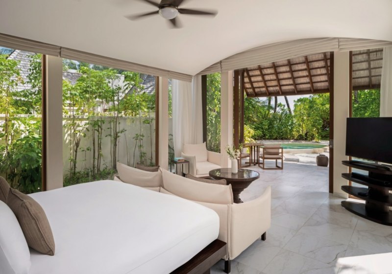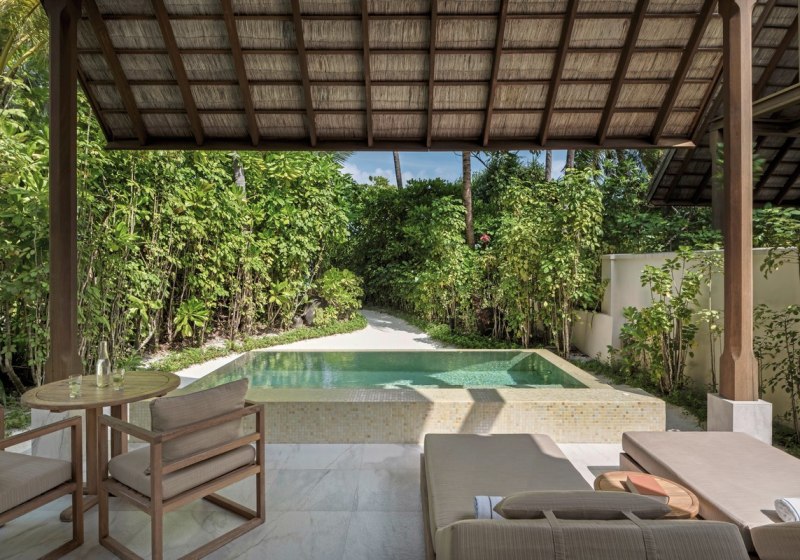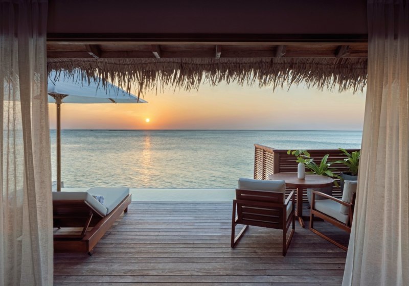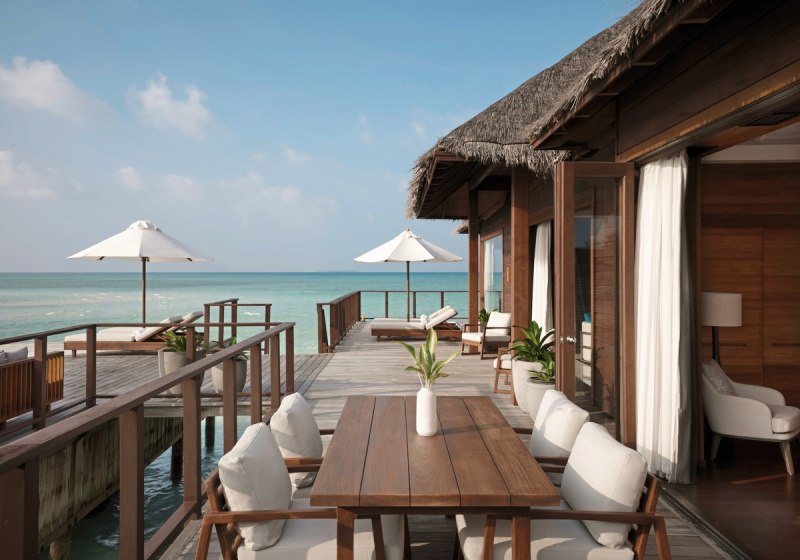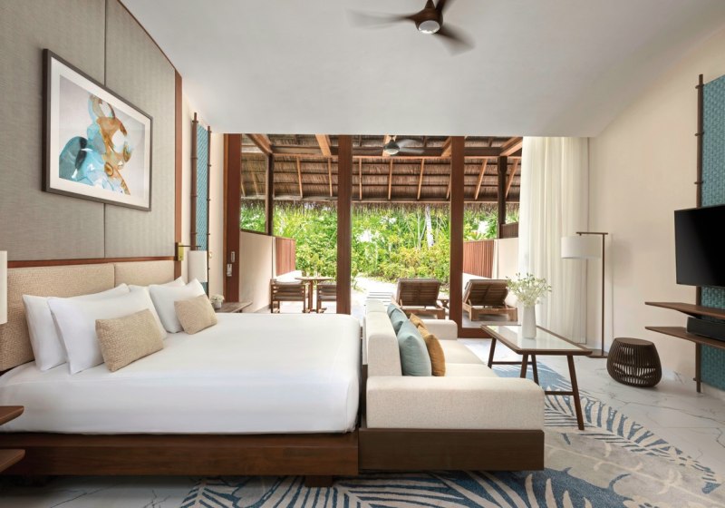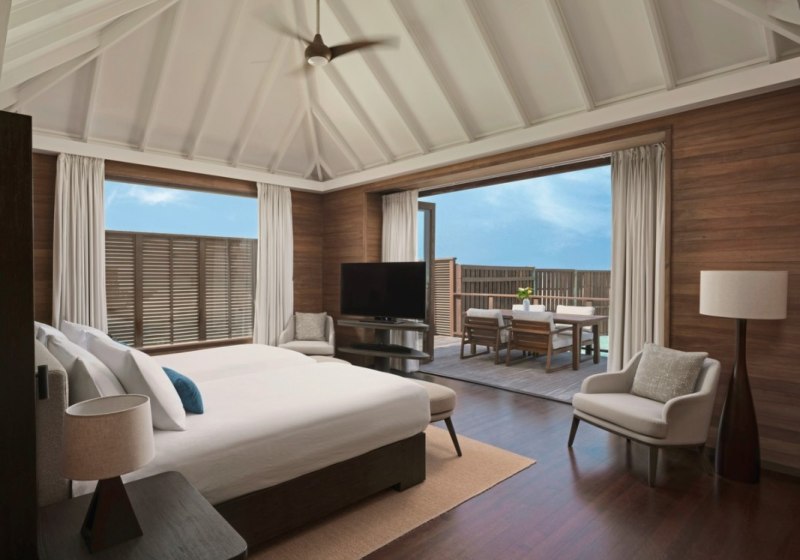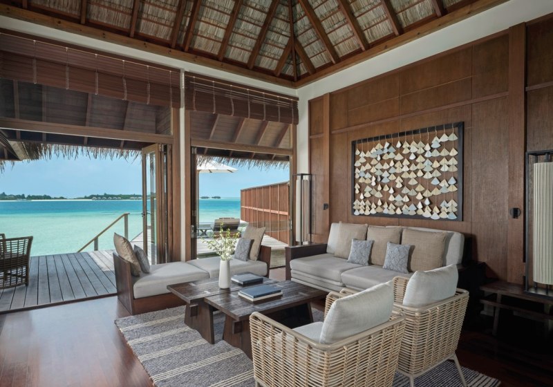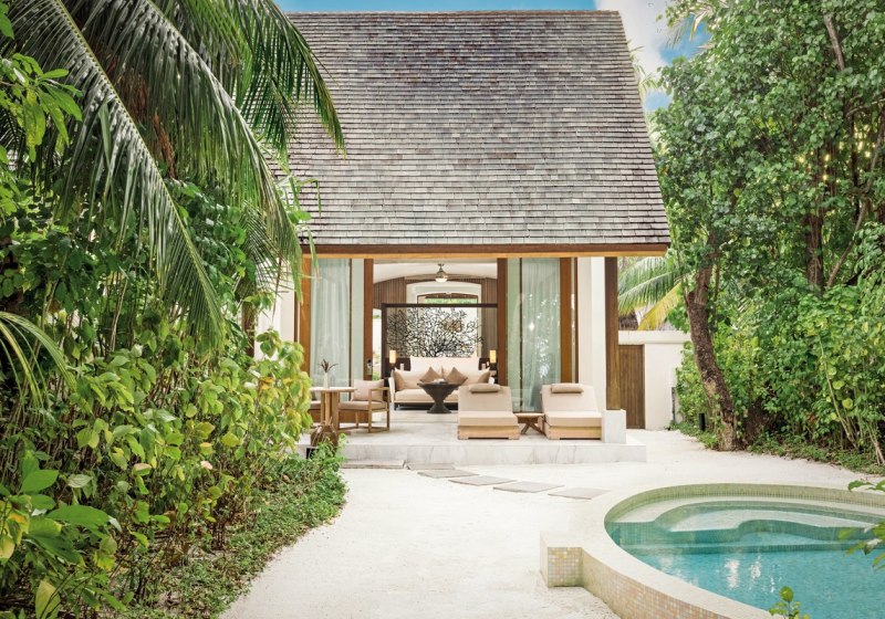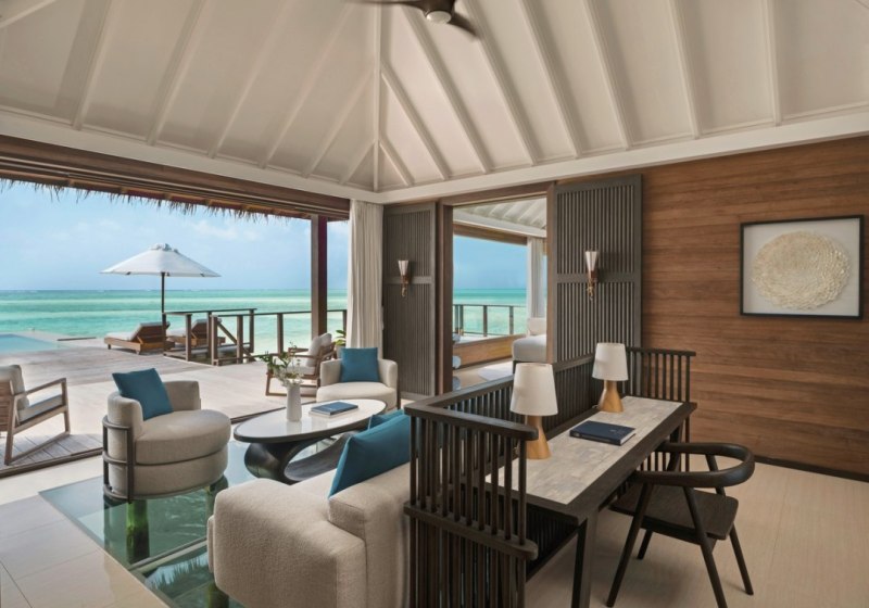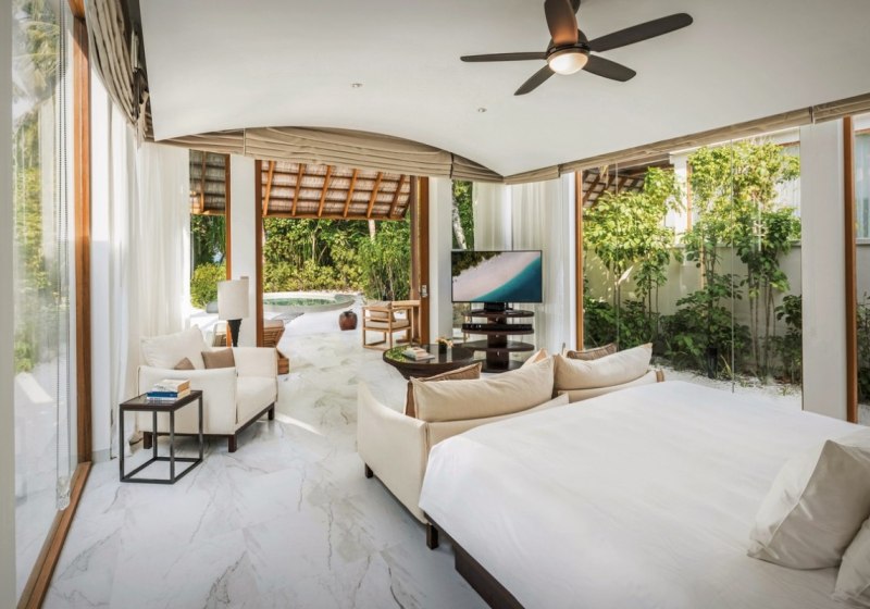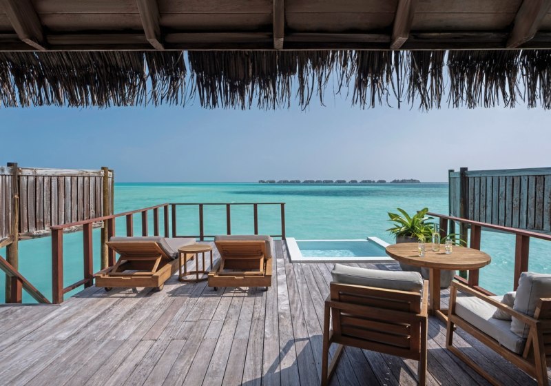 Über dem Wasser wohnt Ihr in der Sunrise Water Villa mit etwa 86 Quadratmetern, privatem Sonnendeck und Pool; zur Abendseite eröffnet die Sunset Water Villa ihre Sicht, ebenfalls mit privatem Plunge Pool. Die Deluxe Beach Villa (ca. 300 Quadratmeter) wurde 2019 renoviert und kombiniert Gartenbereiche mit Pool und zusätzlichem Plunge Pool.