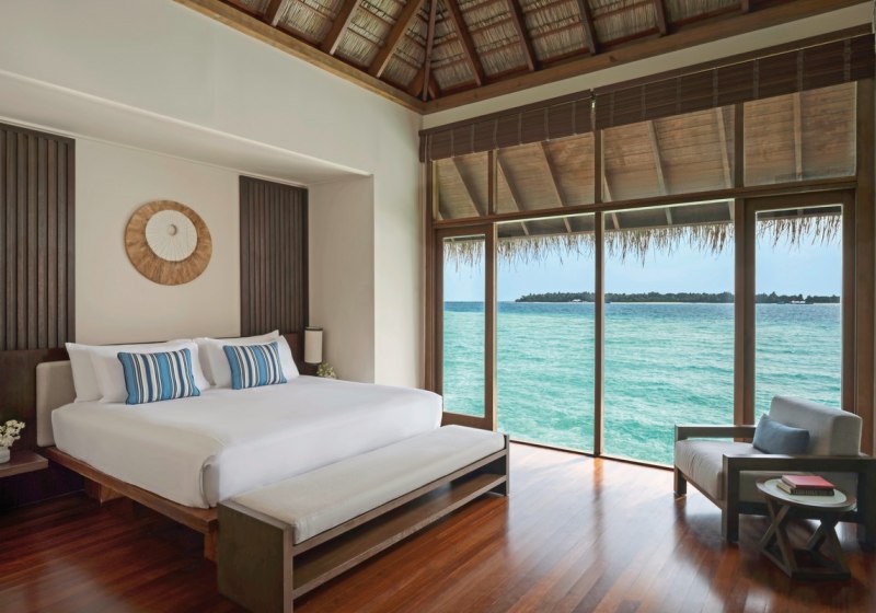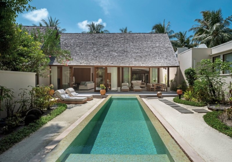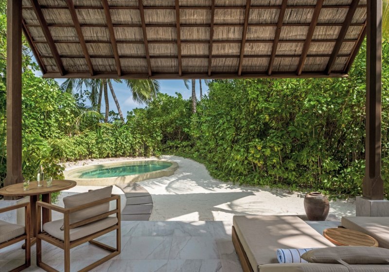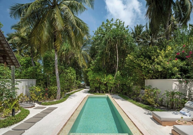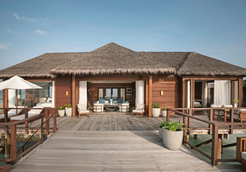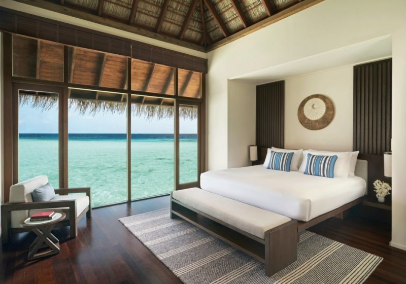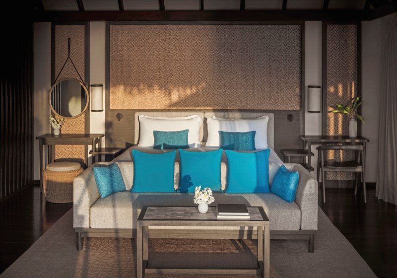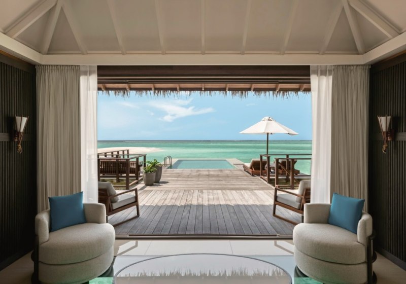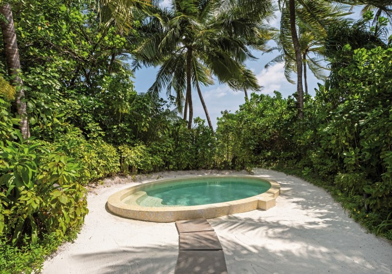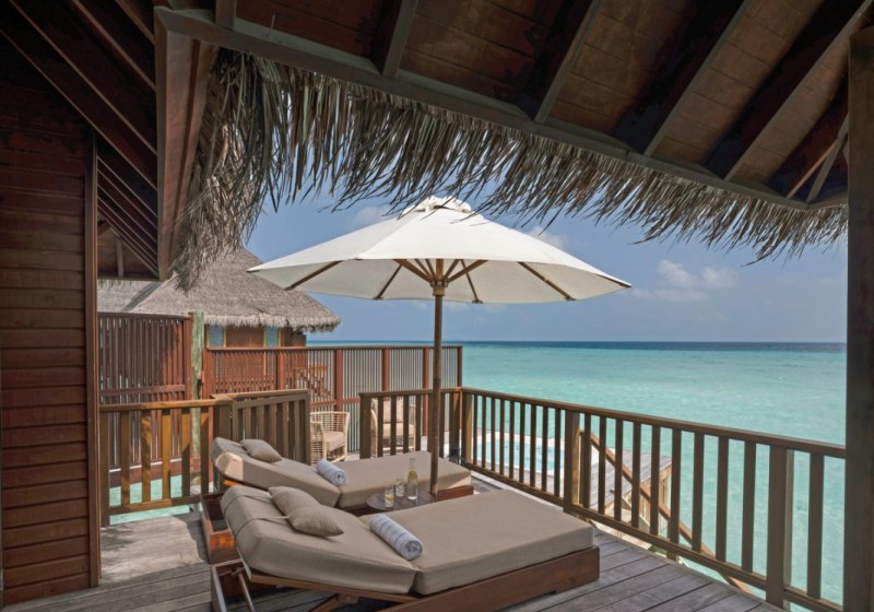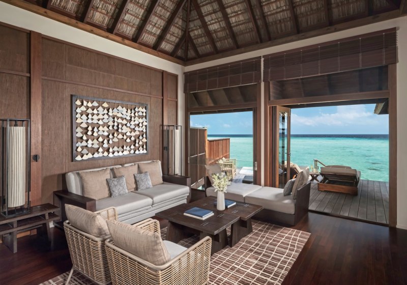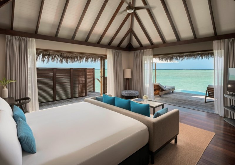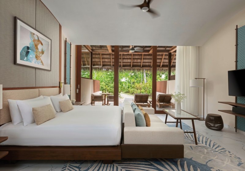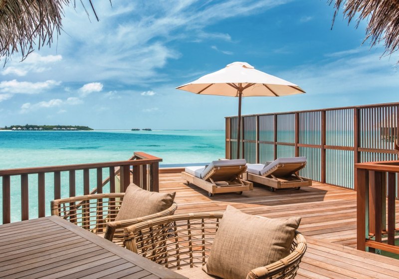 Über dem Wasser wohnt Ihr in der Sunrise Water Villa mit etwa 86 Quadratmetern, privatem Sonnendeck und Pool; zur Abendseite eröffnet die Sunset Water Villa ihre Sicht, ebenfalls mit privatem Plunge Pool. Die Deluxe Beach Villa (ca. 300 Quadratmeter) wurde 2019 renoviert und kombiniert Gartenbereiche mit Pool und zusätzlichem Plunge Pool.